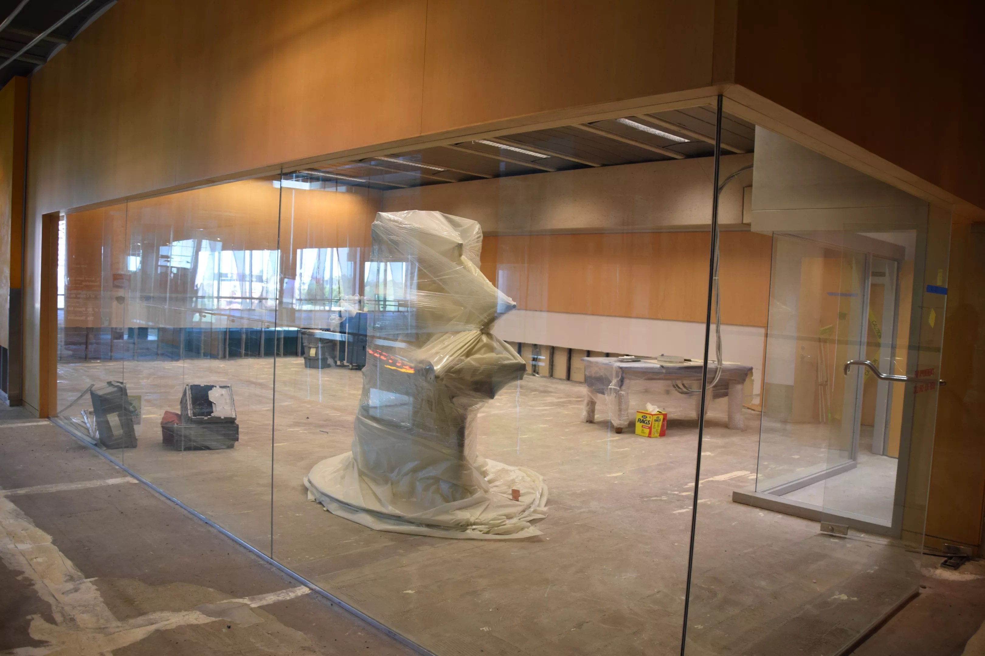 The building itself suffered considerable damage, which is still being assessed. Visible signs of the storm’s aftermath inside the library include concrete floors without carpet, open drywall, and remaining items wrapped in plastic.