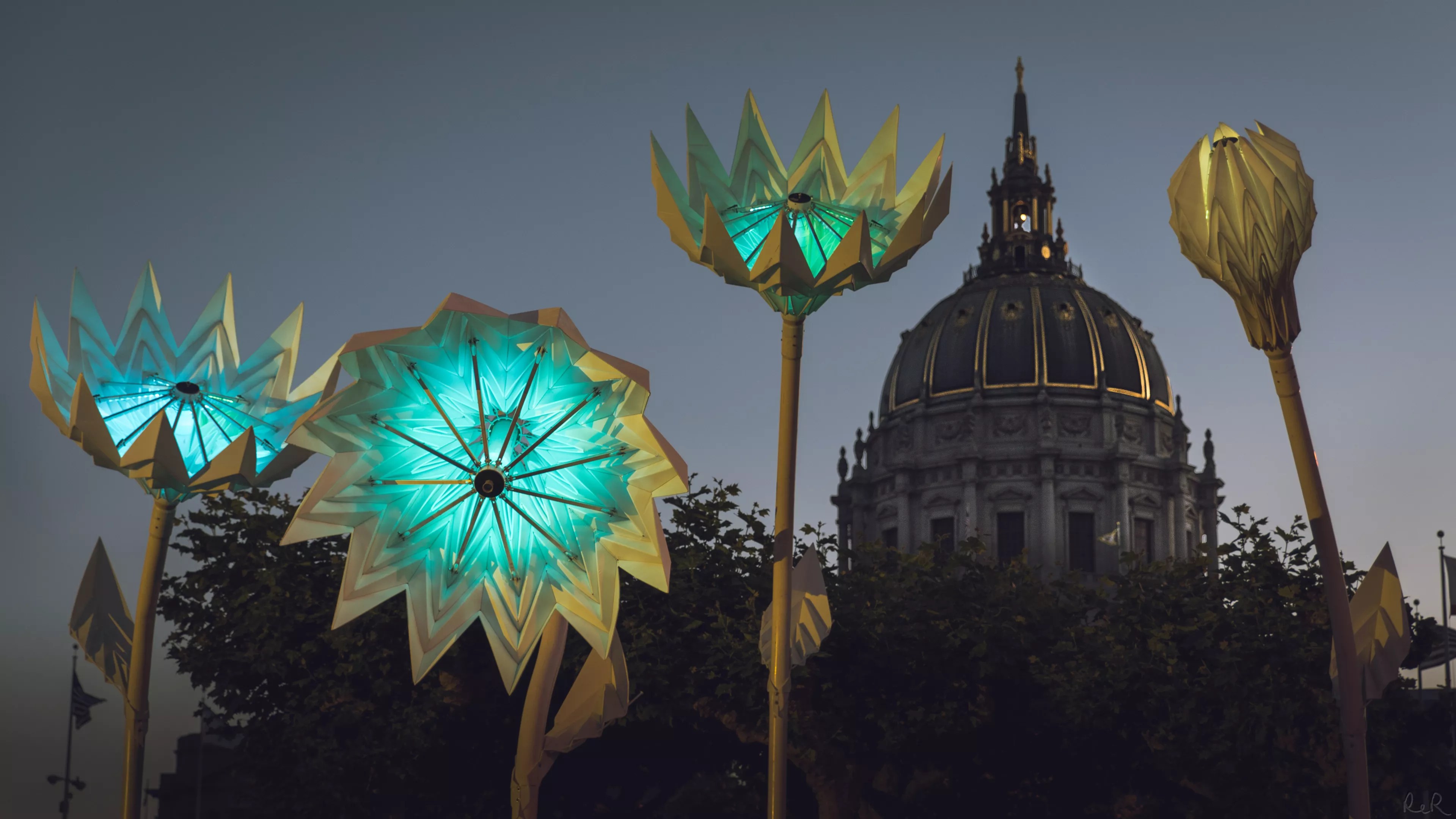 Seven large-scale origami flowers that bloom and glow in different colors as people move around them, which premièred during the Burning Man Festival in 2013.