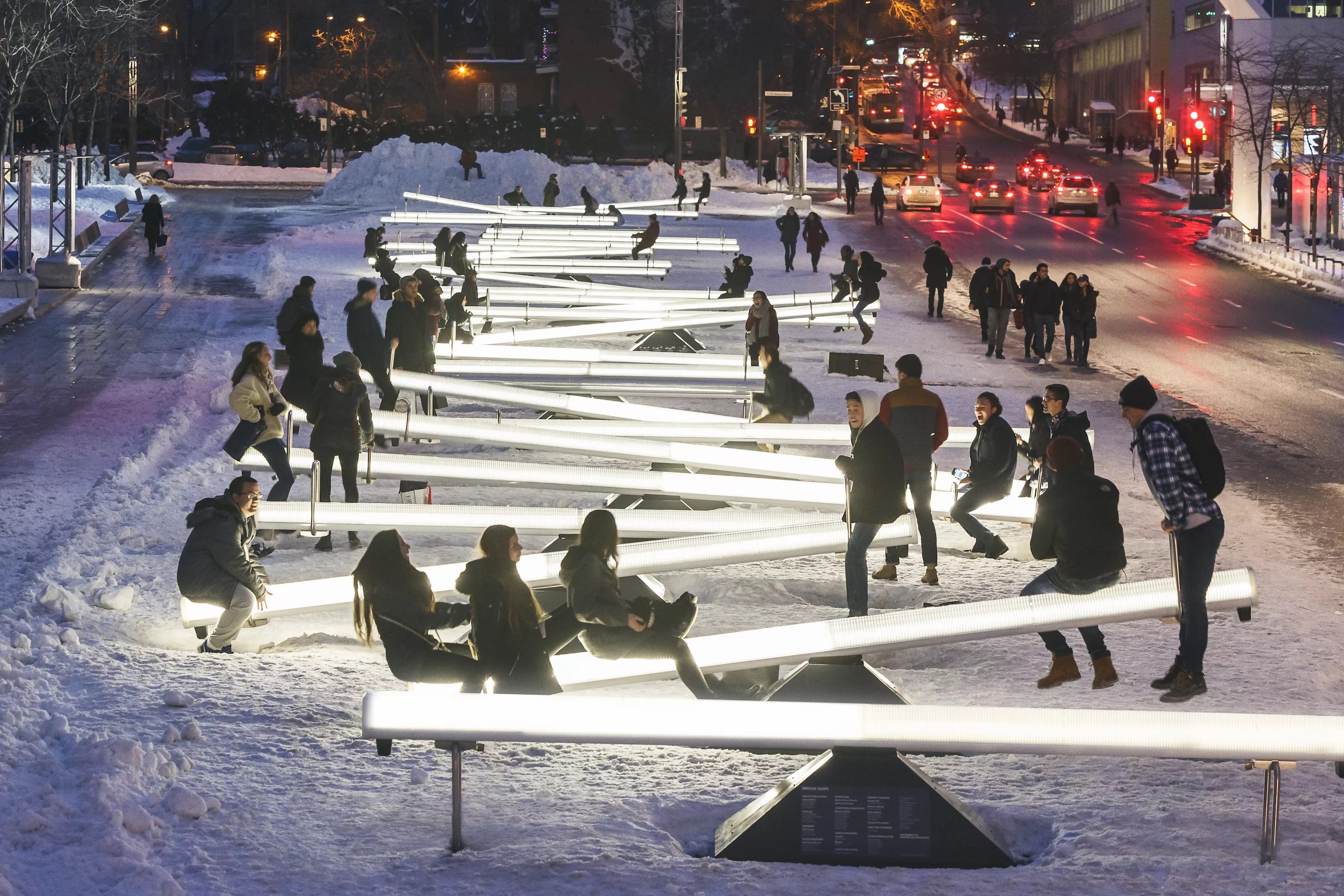 Fifteen large-scale, illuminated seesaws that create a playground of movement and light.