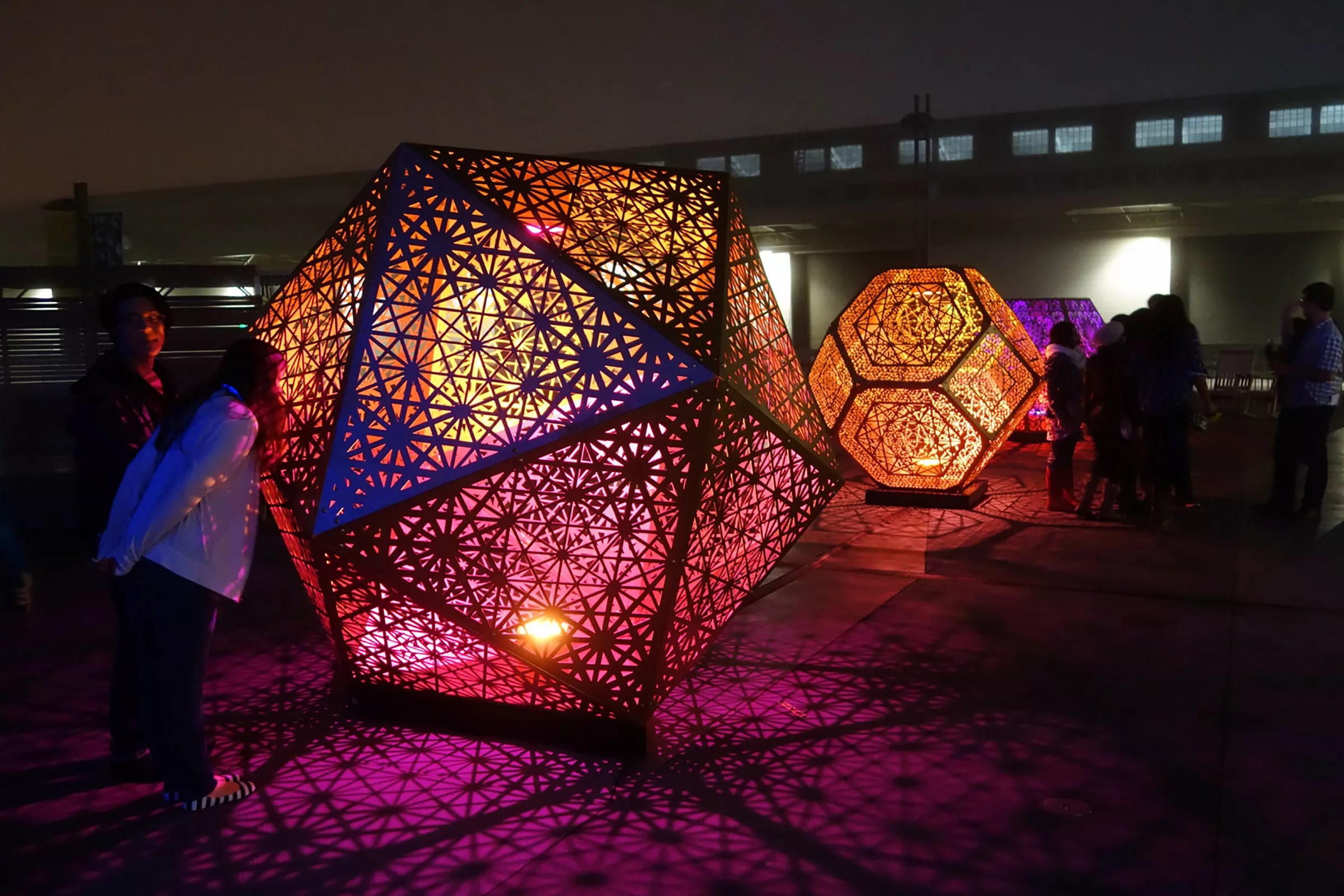 Three LED-lit 7-foot-tall polyhedron sculptures inspired by ancient Islamic tiles, natural forms, mathematics, and geometry.