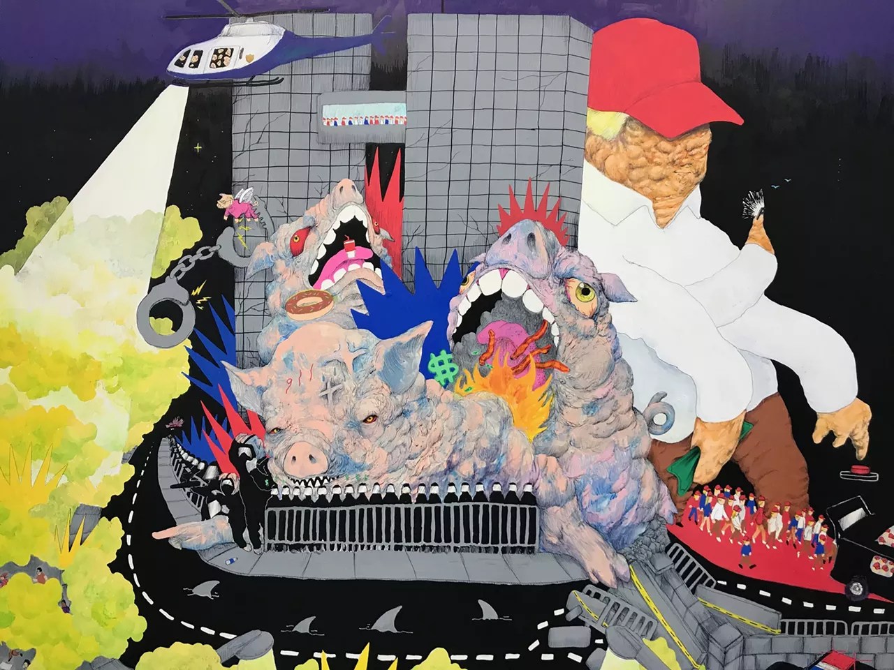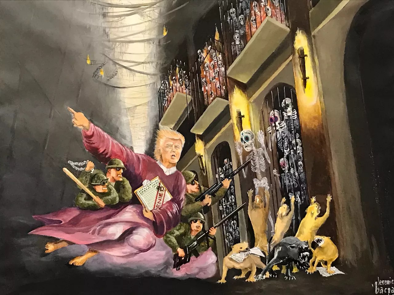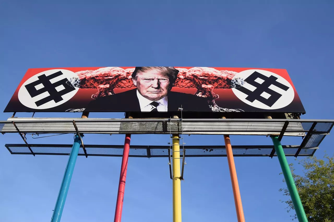 As Donald Trump celebrates his 79th birthday on June 14, we’re taking a look back at some of the best Trump-inspired art we’ve seen around the Valley in recent years. One artist painted Trump reclining in a pink bathrobe. Another gave him a mustache with horrific historical overtones. Still other Arizona artists portrayed the president as a felted troll doll, a wide-mouthed pinata or a sinister court jester. But whatever the form, it’s clear that the artistic community has plenty of opinions about the commander-in-chief. Here’s the way local creatives, and a few others, see Trump – in all his narcissistic glory. Happy birthday, Mr. President.