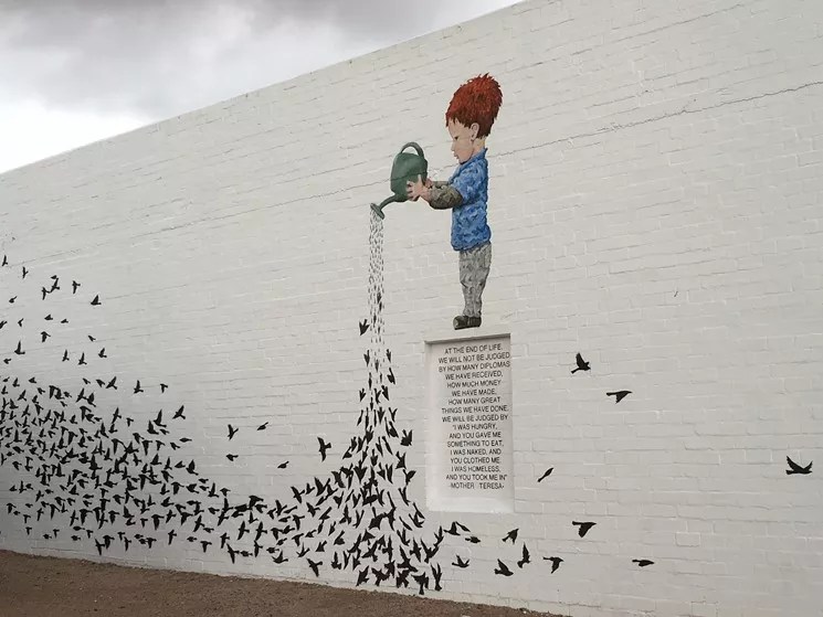 The building’s exterior has several murals created by Arizona-based artists, including Sky Black, Lauren Lee, Kyllan Maney, and JB Snyder. Most prominent is a mural on the west-facing exterior, inspired by the I Have a Name Project and conceived by Jon Linton along with Rainey and the mural’s artist, Brian Boner. Snyder’s mural on the east-facing exterior is a popular backdrop for selfies and other photos.