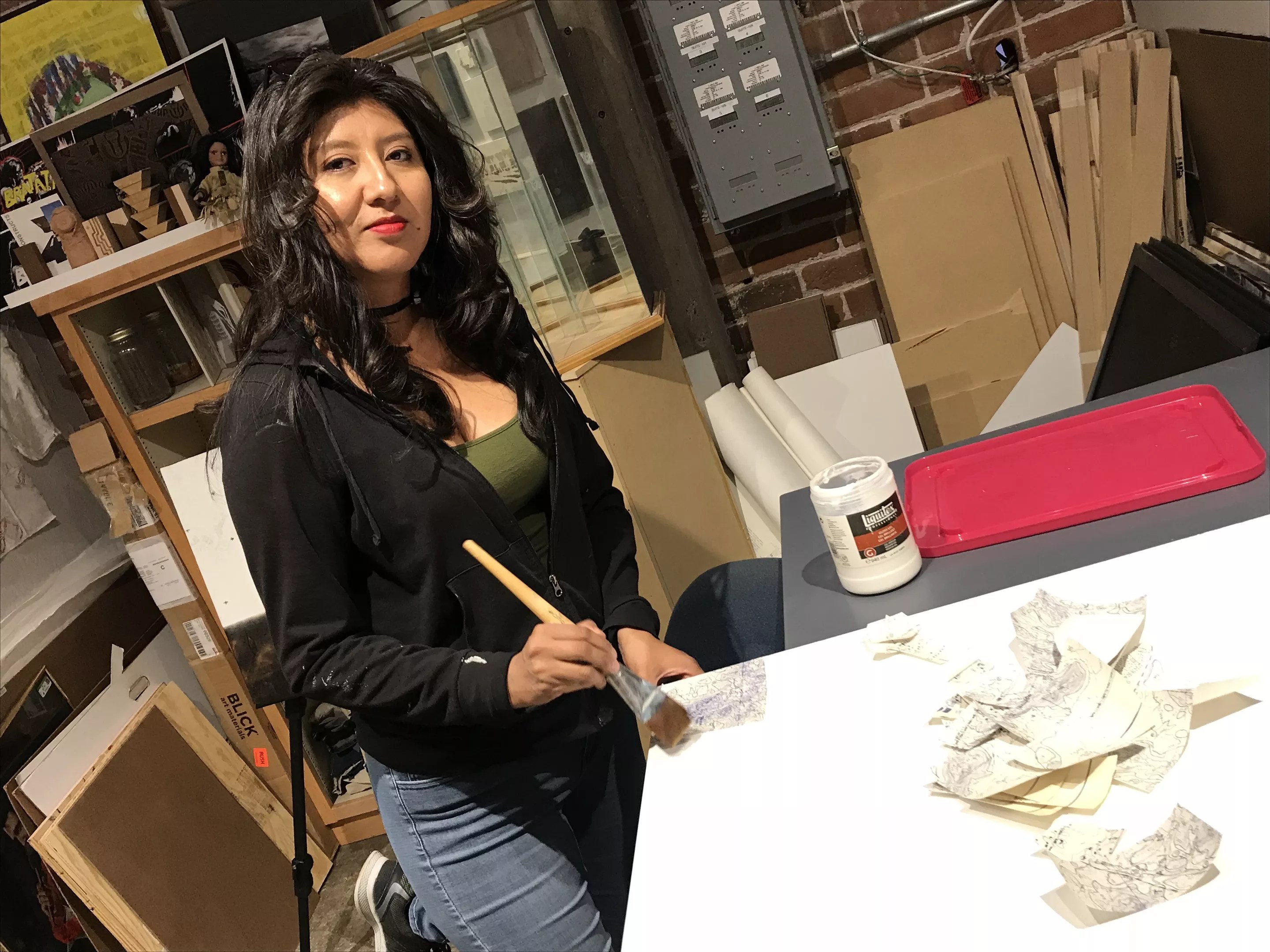 Watching artist Monica Wapaha start a new piece.