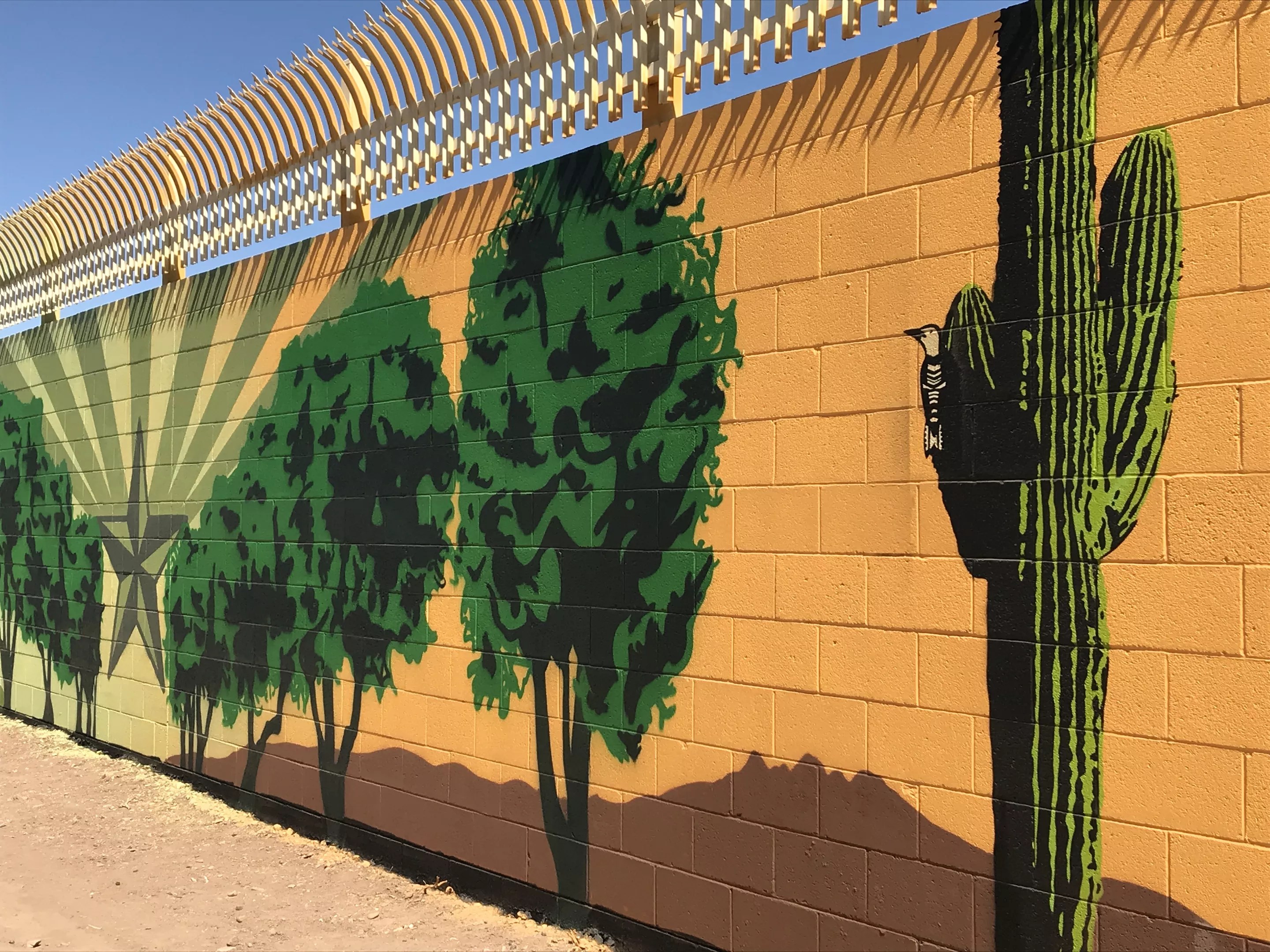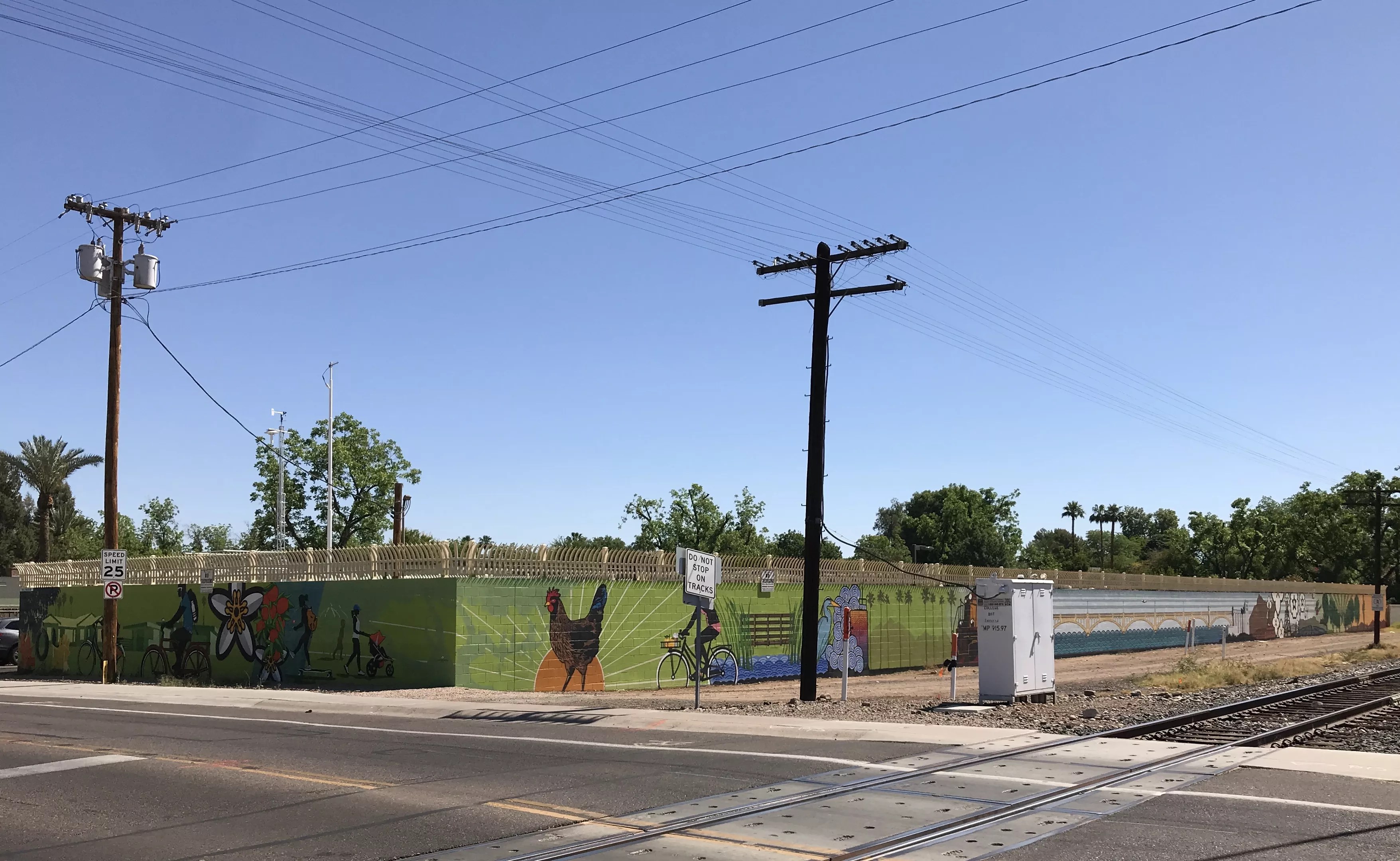 The longer portion of the mural, which parallels the railroad tracks, features several vignettes of Tempe’s past. It shows people of color picking cotton and doing brickwork. It’s got Tempe landmarks like “A” Mountain and the Hayden Flour Mill. And it features an assortment of animals and plants, including a rooster and saguaro cactus.