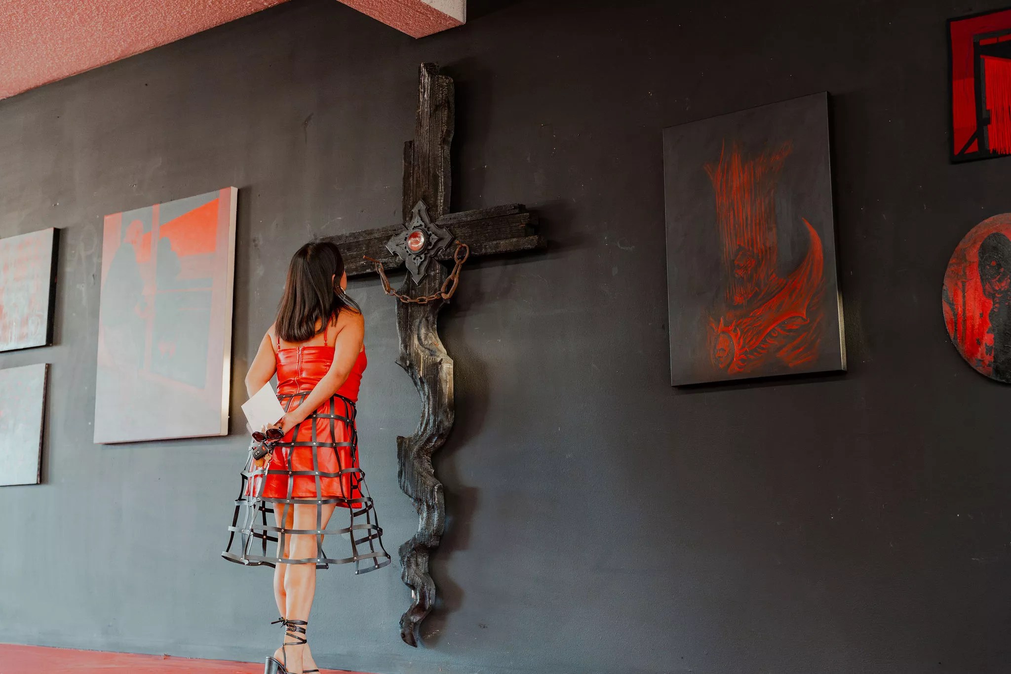 The “Black and Red” group show in the plaza’s Red Floor Gallery was inspired in part by the room’s color scheme. But entering a smaller chamber within the gallery called La Pequena Galeria – while ducking to get into the mini-gallery that was converted from a bathroom – Moore explained that the theme was conceived of when it became clear that the Danelle Project’s days running the show in the plaza were numbered.