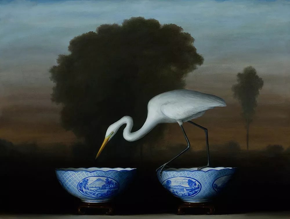 See David Kroll’s Egret and Blue Bowls (oil on linen, 2017) at Lisa Sette Gallery.