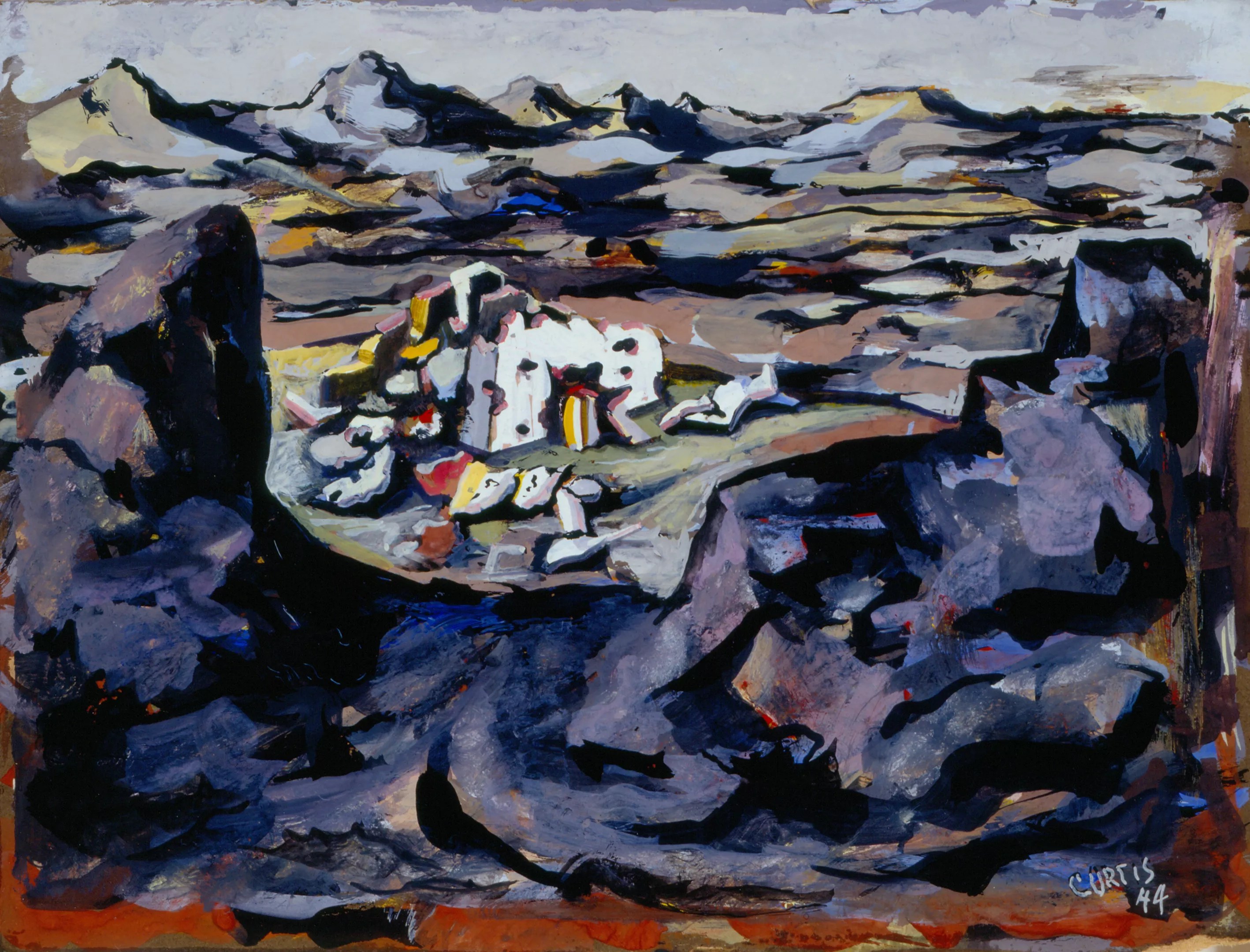 Philip C. Curtis, Landscape with Destruction, 1944. Watercolor on illustration board. Collection of Phoenix Art Museum, Gift of the Philip C. Curtis Restated Trust U/A/D April 7, 1994.