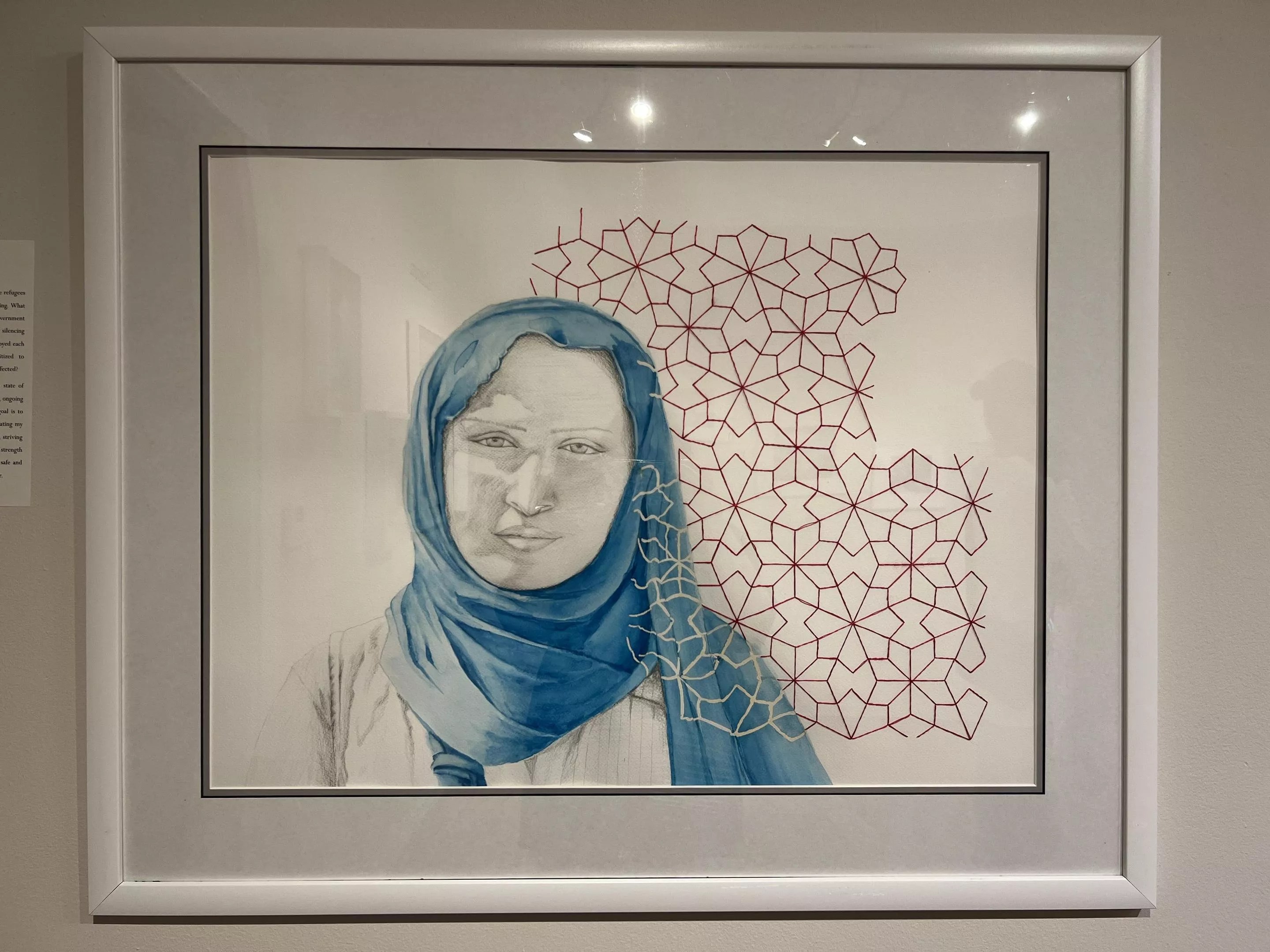 “In Spite of the Unknown, She Is the Reflection of Strength” is a work by Laura Rodriguez in her “Common Threads: An Anthology of Women” show at Eye Lounge.