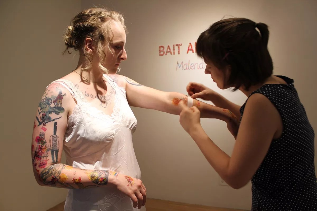 Malena Barnhart (right) and Kristen Schneider doing a durational performance at Eye Lounge in June 2017.