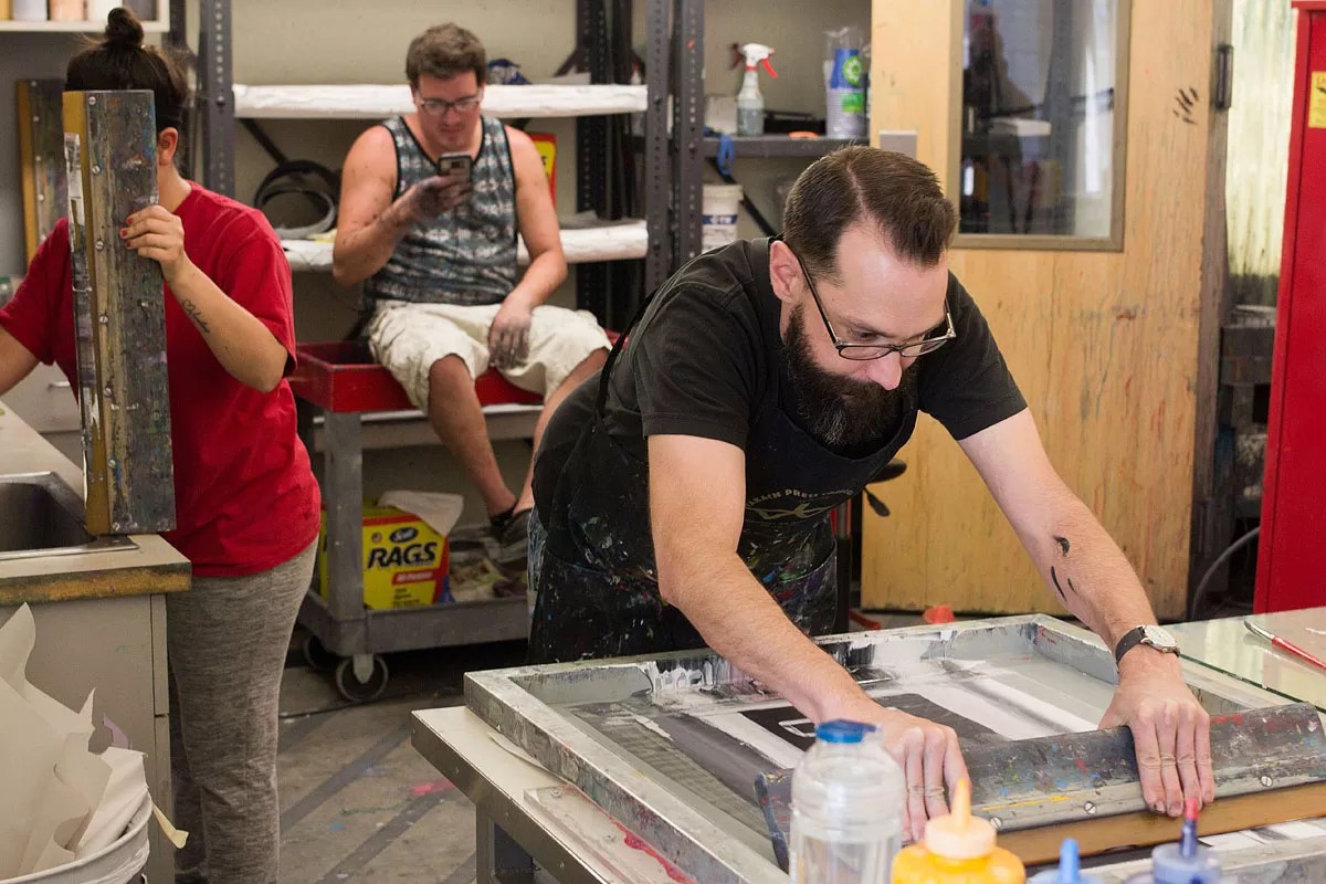 Jeremy Yocum about to pull his own screened monoprint at Mesa Arts Center.