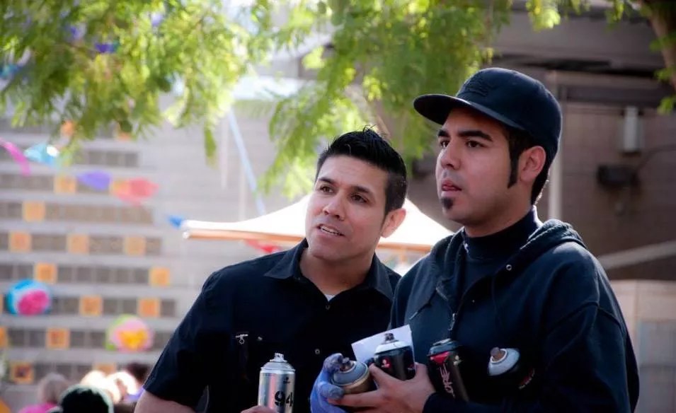 Such (left) and Champ Styles pause from live painting during a festival at Mesa Arts Center.