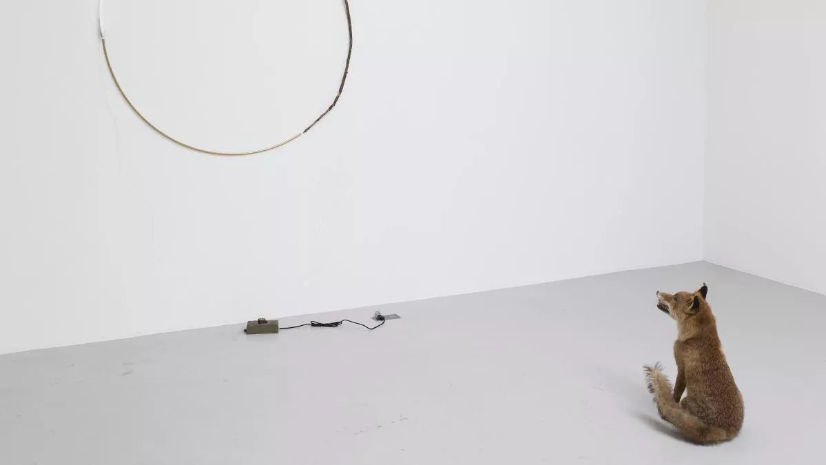Gabriel Rico, ODA II, 2016. Taxidermy fox, brass, branch, neon, concrete and rock, 230 x 190 x 300 cm.