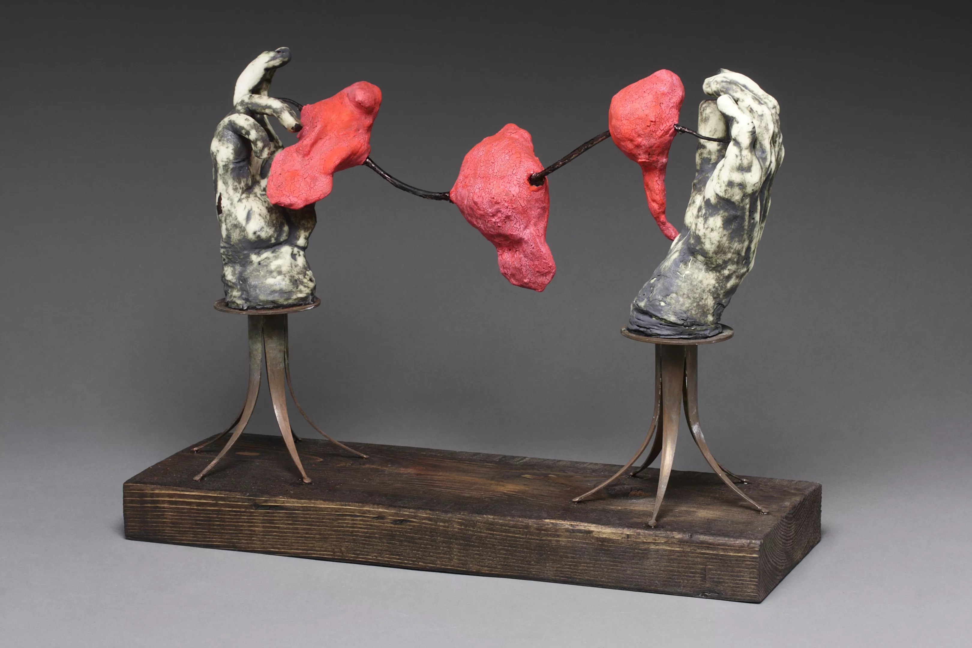 Constance McBride, Between Two Worlds, 2016. Ceramic, iron oxide, steel, wood.