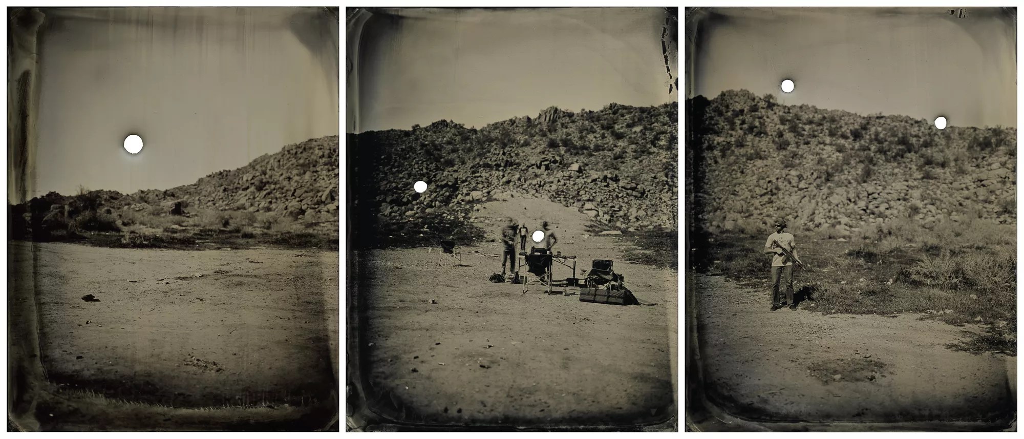 With her darkroom tent and tintype gear, Tempe-based artist Kari Wehrs took to the Arizona desert in search of places used for target practice. Then she invited recreational shooters to pose for tintype portraits before giving them the chance to shoot at their own photographic image. She chose tintype photography in part because it was the main photographic medium available during the Civil War. Now you can see a selection of these works during her free “Shot” exhibition at Tilt Gallery, 7707 East Main Street, #14. The artist reception happens from 7 to 9 p.m. during Scottsdale’s Thursday ArtWalk on August 15. The show runs through September 29. Visit the Tilt Gallery website. Lynn Trimble