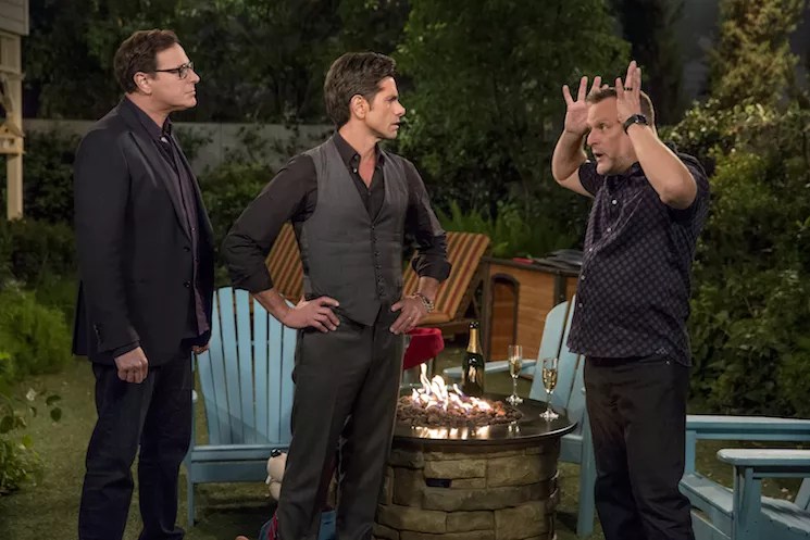 Meanwhile, Danny, Joey, and Jesse are outside by the fire pit, celebrating the fact that Jesse and Becky will be picking up their newly adopted daughter who just so happens to live in San Francisco. (How convenient!) They reminisce about how they had a similar celebration nearly 40 years ago(!) when DJ was born.