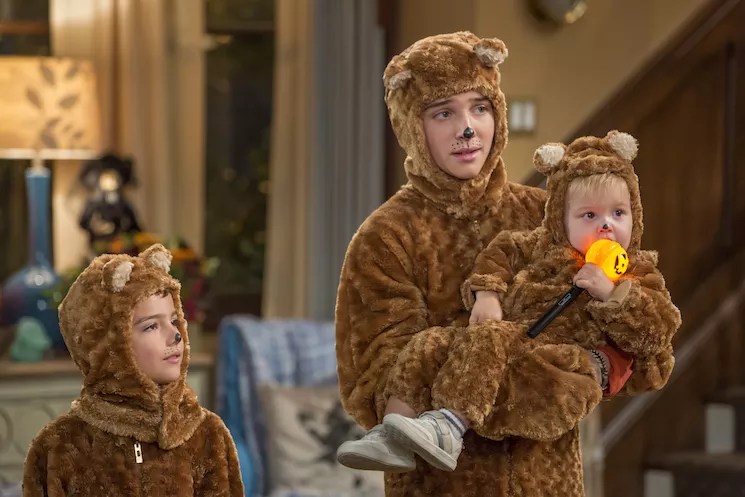 However, things aren’t going well back at the party. Despite his Mom’s best efforts, a very surly Max can’t get over the fact that it’s just not spooky enough. He mopes around in his bear costume (which zaps any sort of credibility he has, tbh). The snacks, decorations, and even the dog (dressed as a devil) are more adorable than anything, and baby blogger Taylor is equally underwhelmed. It’s pretty unfair considering how much work DJ put in and frankly, Max was being a real dou … err … party pooper.