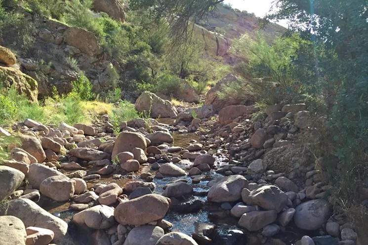 Rocky water crossing of Hackberry Spring Loop. This trail highlights the immense diversity of the desert in a quick 5.5-mile trek.