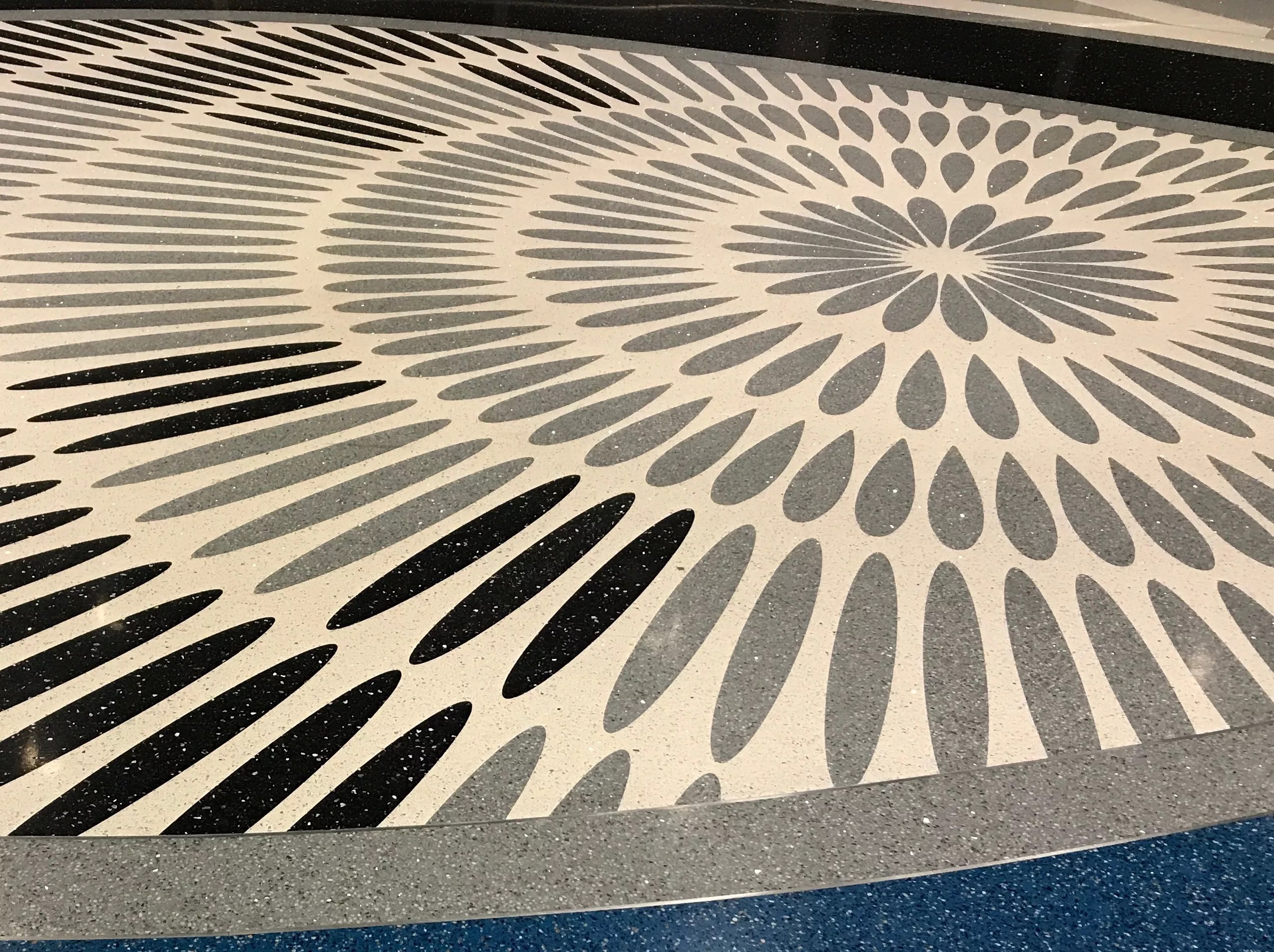 The East Economy Station has its own terrazzo masterpiece, Anne Coe’s Topo Magic, located on the station platform. Inspired by topographic maps she uses while hiking, Coe used 11 colors to “depict rivers, canyons, farm fields, and mountains in a whimsical landscape of wiggling shapes and contours.”