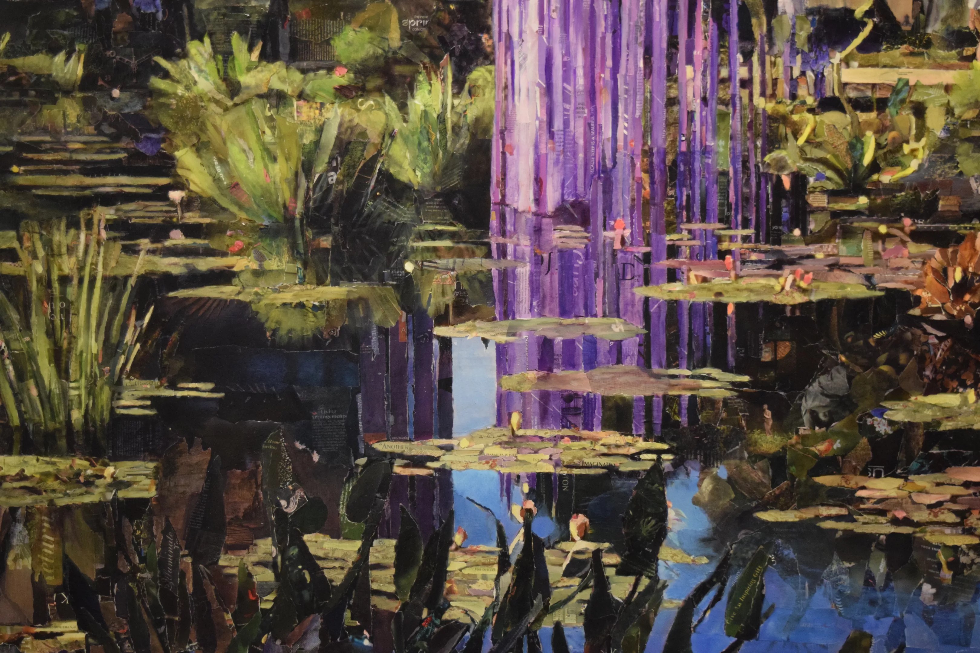 One of several mixed-media collage works featured in her solo exhibition during January at monOrchid’s Shade Gallery, this piece by Aileen Frick was inspired by her experience of seeing Dale Chihuly’s glass works installed at the Desert Botanical Garden.