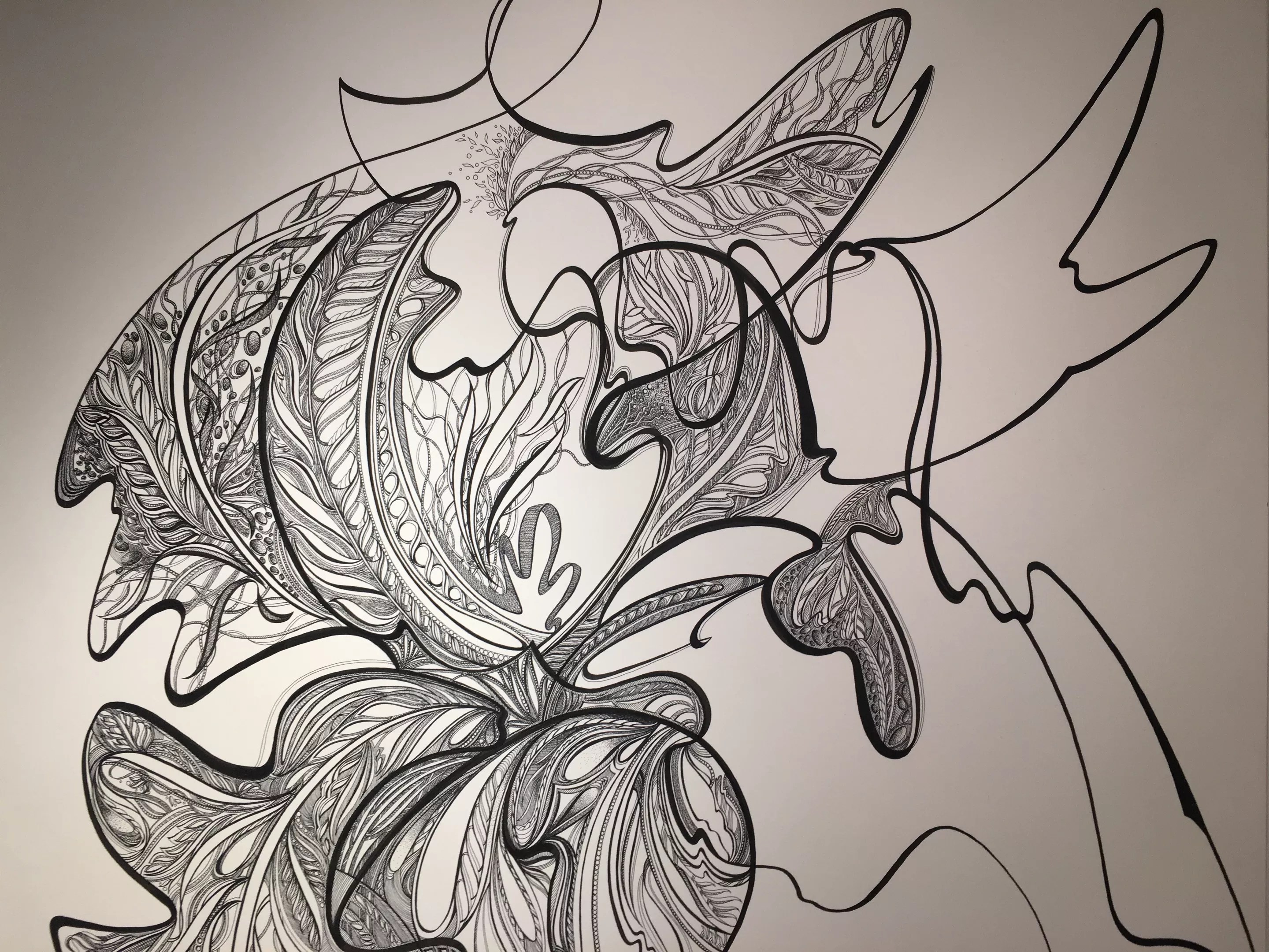 Long before coloring books with flowing black lines on stark white pages became all the rage, Cyndy Carstens was creating black-and-white drawings inspired by music. This piece is one of several such works on view at Carstens Gallery in Old Town Scottsdale.