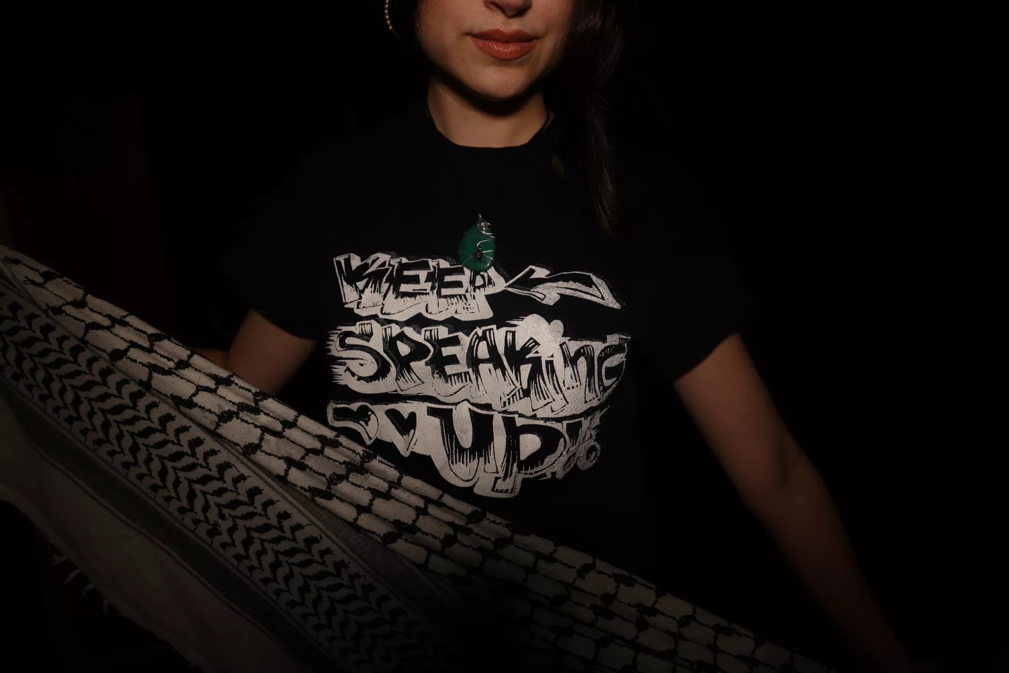 Christina Valles poses in a “Keep Speaking Up” screen-printed shirt she designed in support of the Palestinian people.