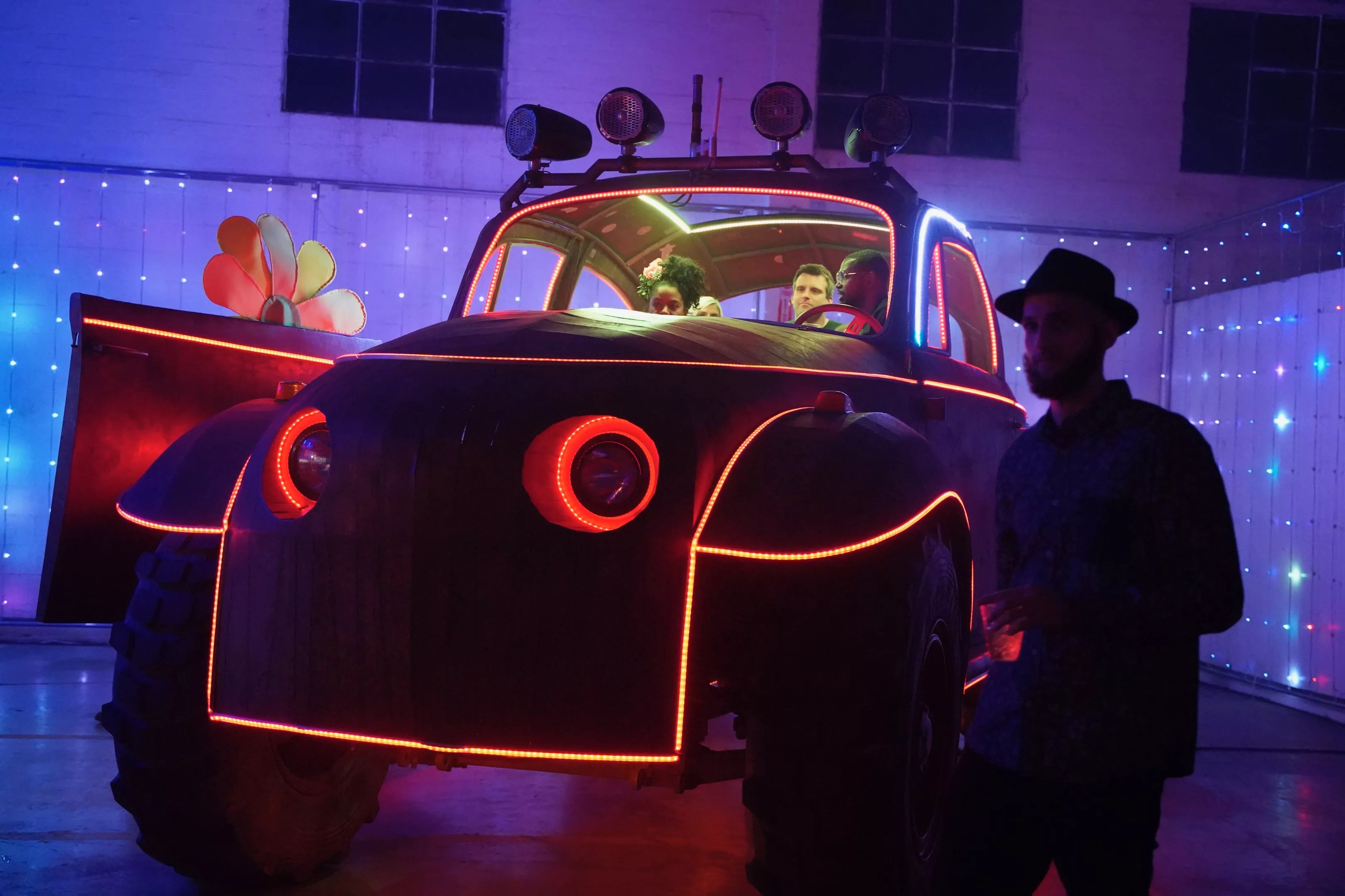 Walter Productions’ art cars are certainly the company’s best-known creations. Each is a custom-built, oversized spectacle brimming with eye-catching lighting and special effects. The fleet includes a gigantic Volkswagen Baja Bug called Big Red; Mona Lisa, a cone-shaped wheeled tank inspired by a Leonardo da Vinci drawing; and a flame-spewing horned truck dubbed Heathen.