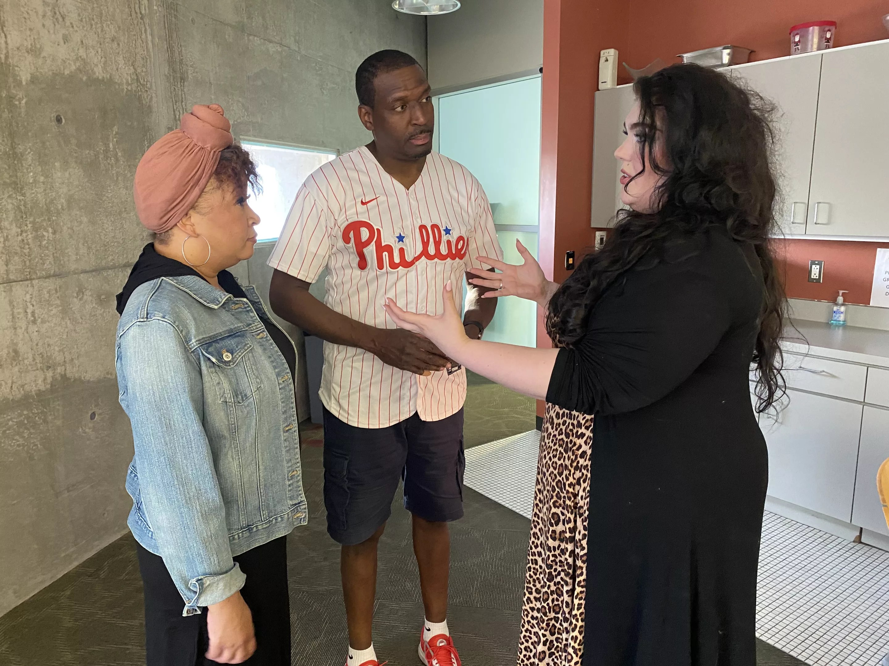 From left, actors Lydia Corbin and Eric Banks discuss a moment in Fairview with intimacy coordinator Monica Sampson.