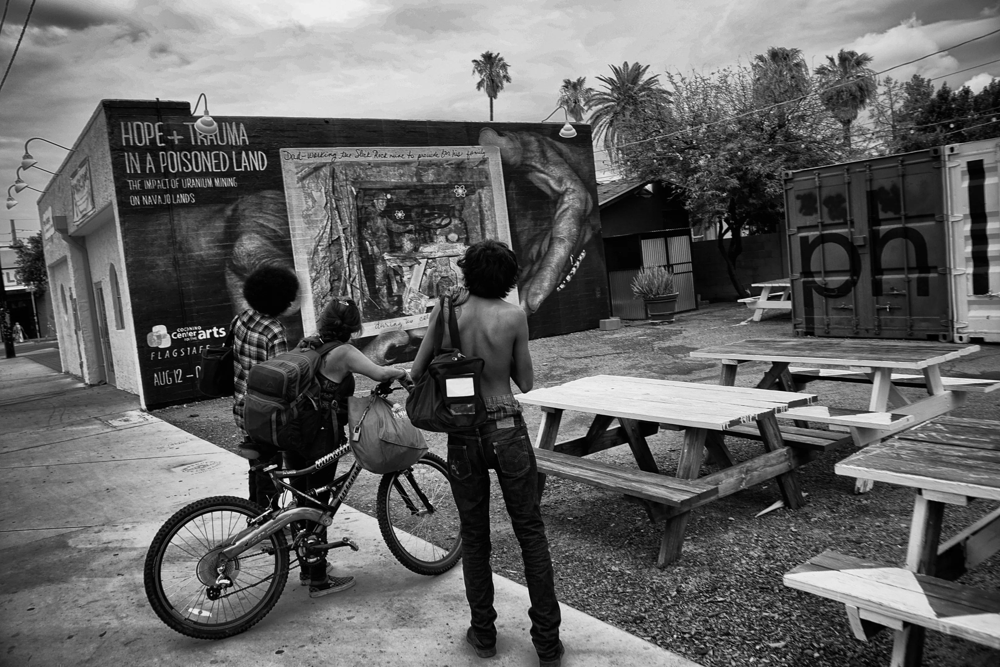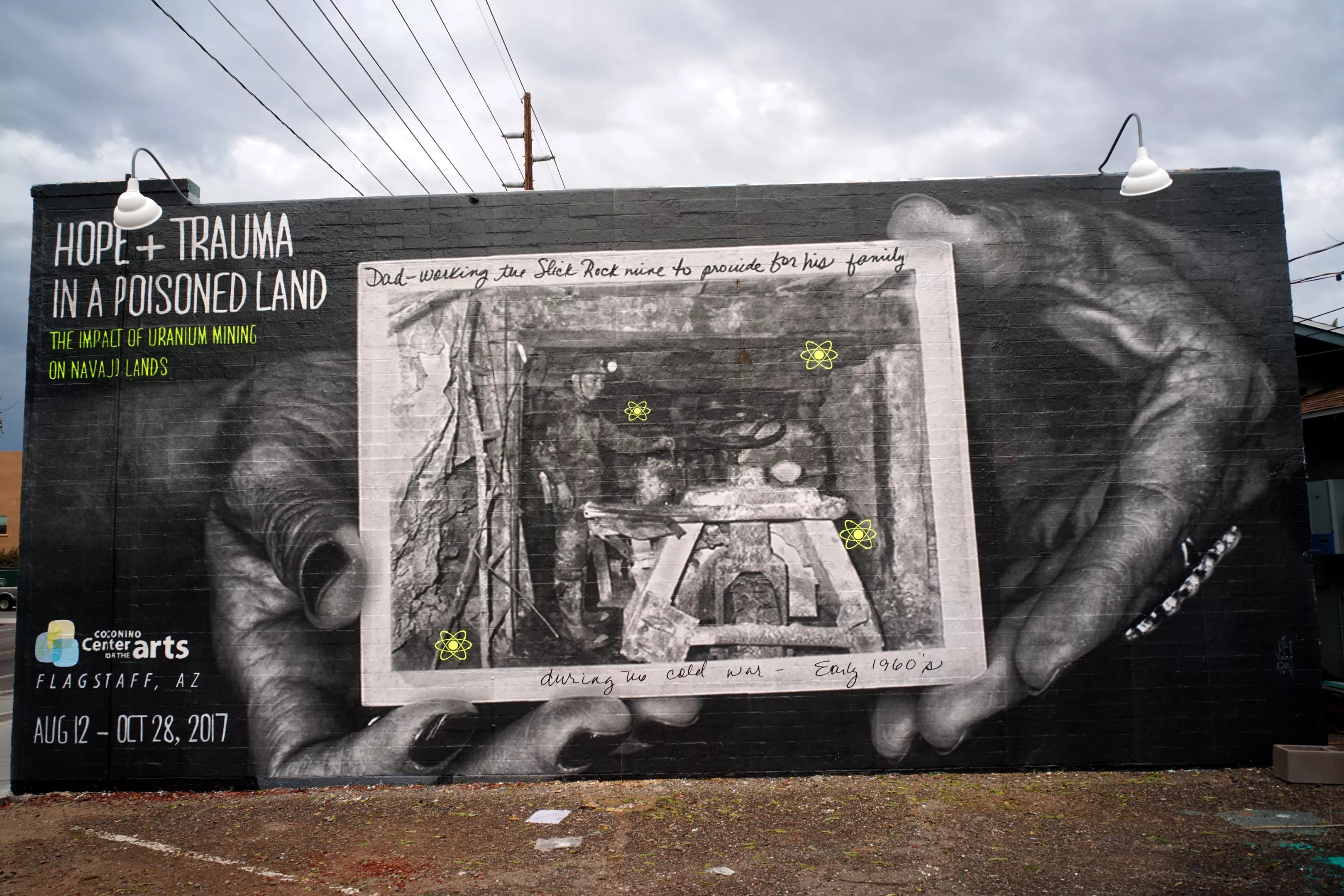 The mural is also an advertisement for an upcoming exhibition at Coconino Center for the Arts, located near downtown Flagstaff. The exhibition is funded in part by the National Endowment for the Arts.