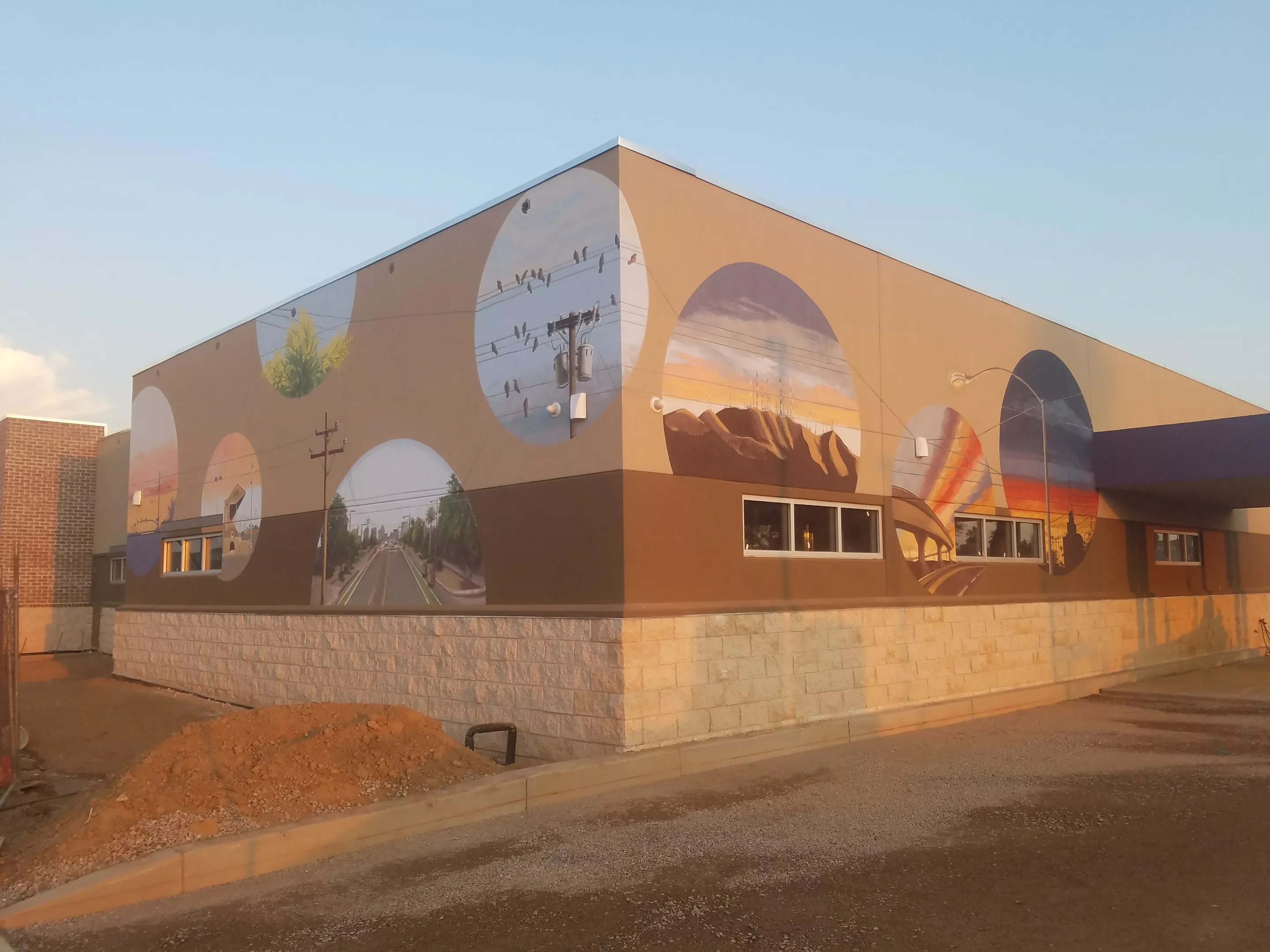 Laura Spalding Best’s newly-completed Convergence mural for Marisol Credit Union.
