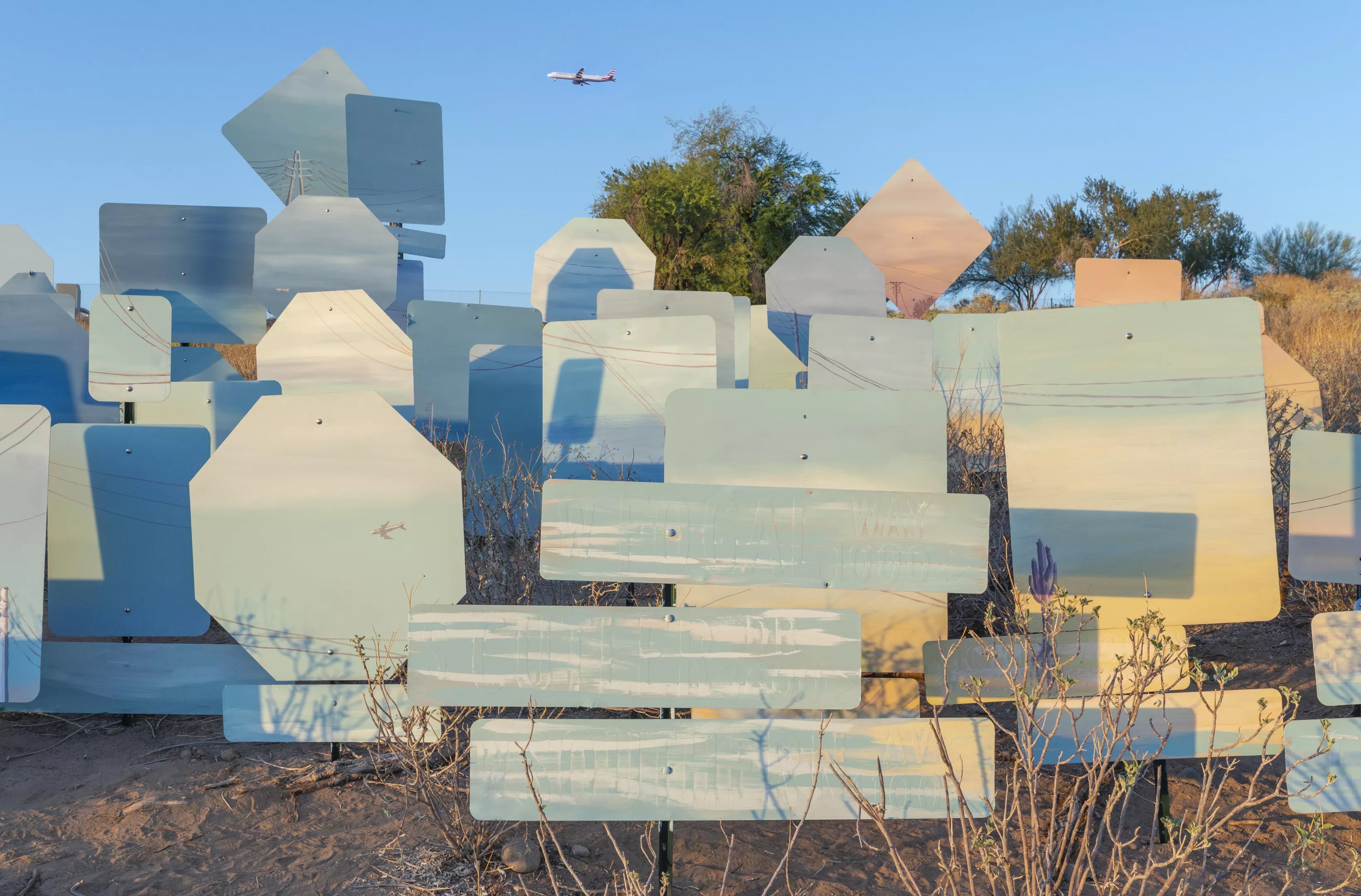 In the fall, Best painted the back of each sign with colors pulled from desert skies, then added palm trees, airplanes, and other elements of the Tempe Town Lake landscape. She’d stack them up along the block wall of her backyard as she finished them, waiting until it was time to install them in November.