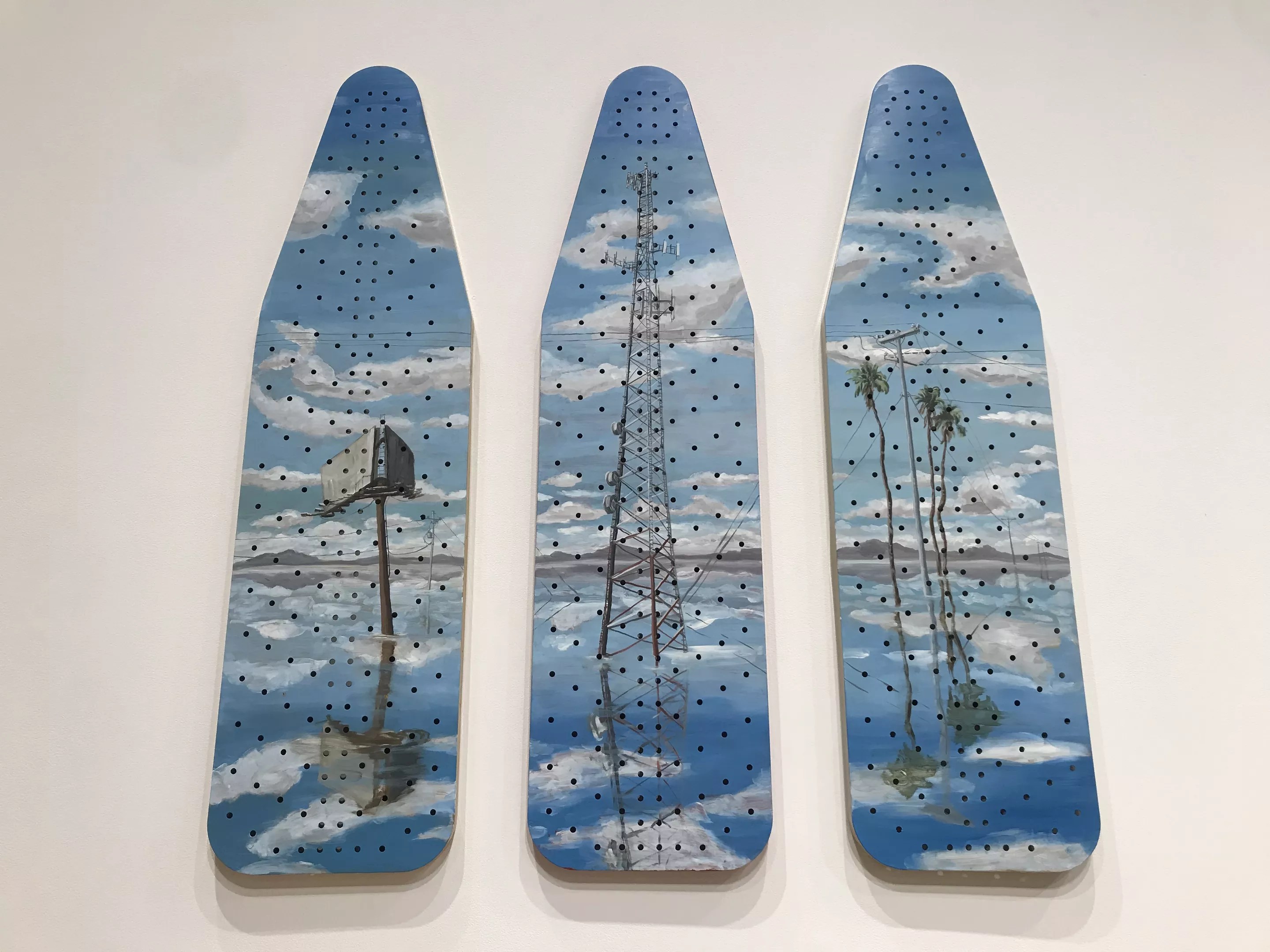 Best used to watch the sun shift over the landscape during days spent painting and interacting with visitors. At the time, the arts center was showing artworks with a water theme, including a trio of her painted ironing boards called The Bountiful Mirage.