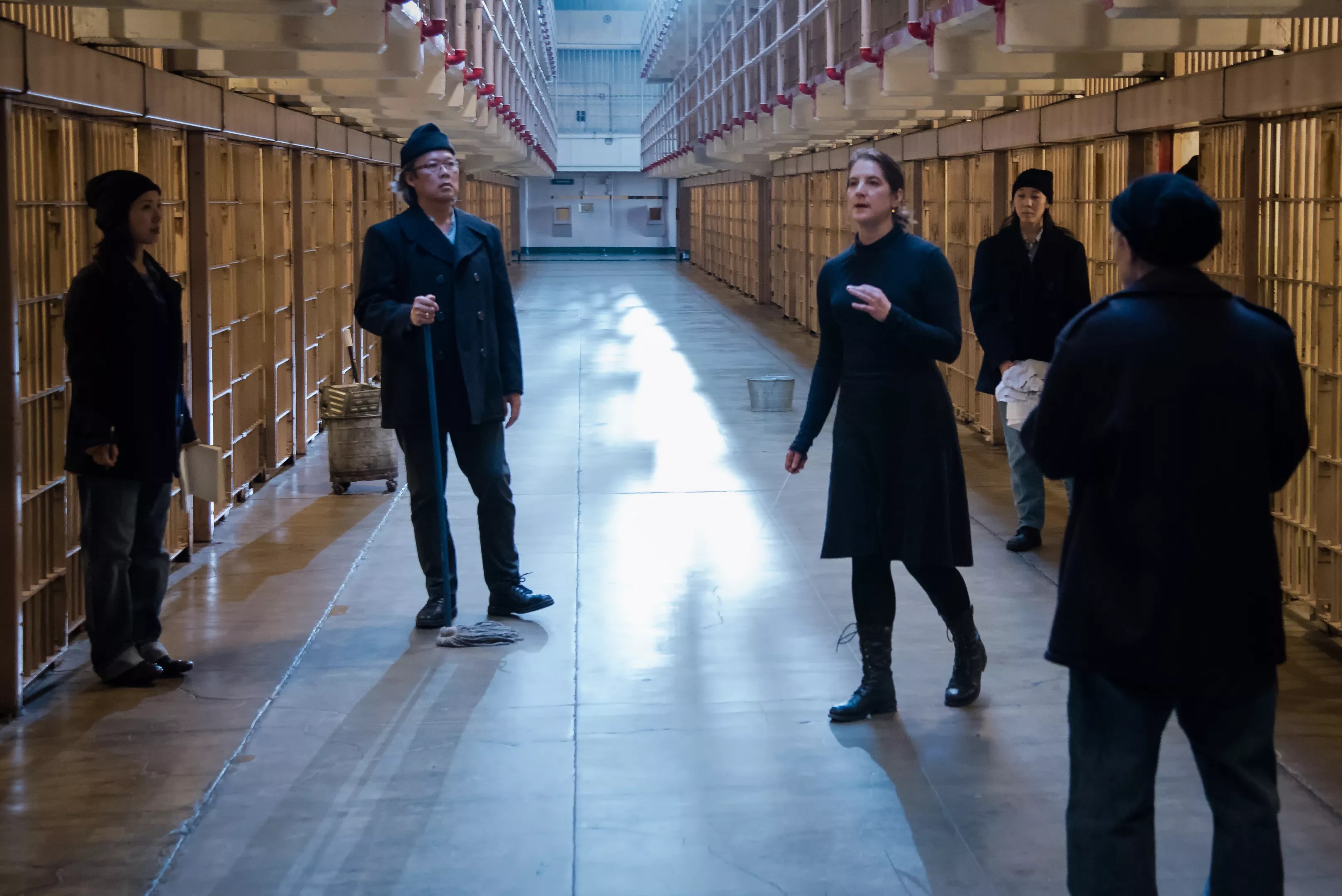 Composer Lisa Bielawa talks with cast members during filming at Alcatraz.
