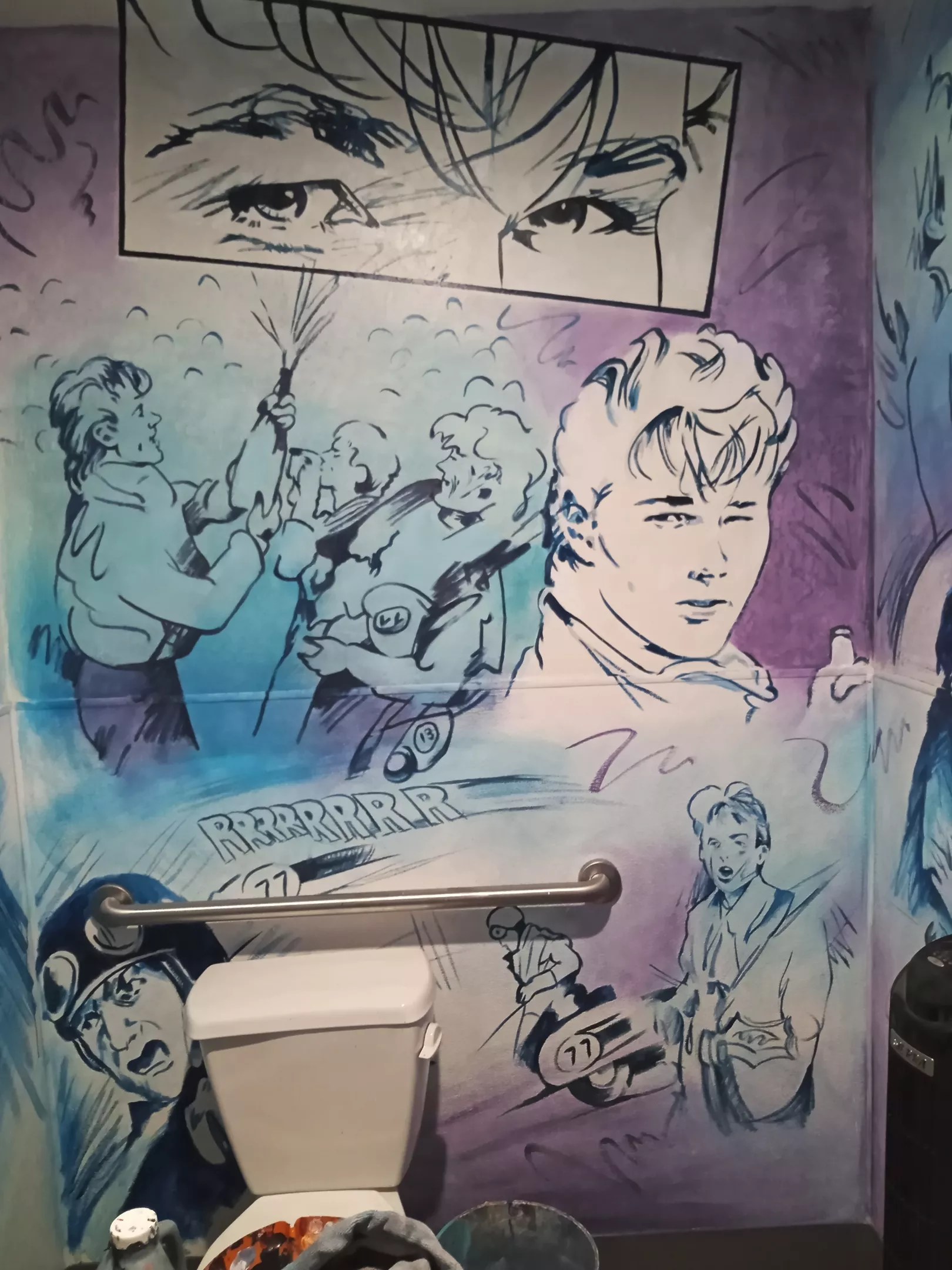 Scenes from A-ha’s “Take On Me” video painted inside the women’s room at Player 1 Arcade.