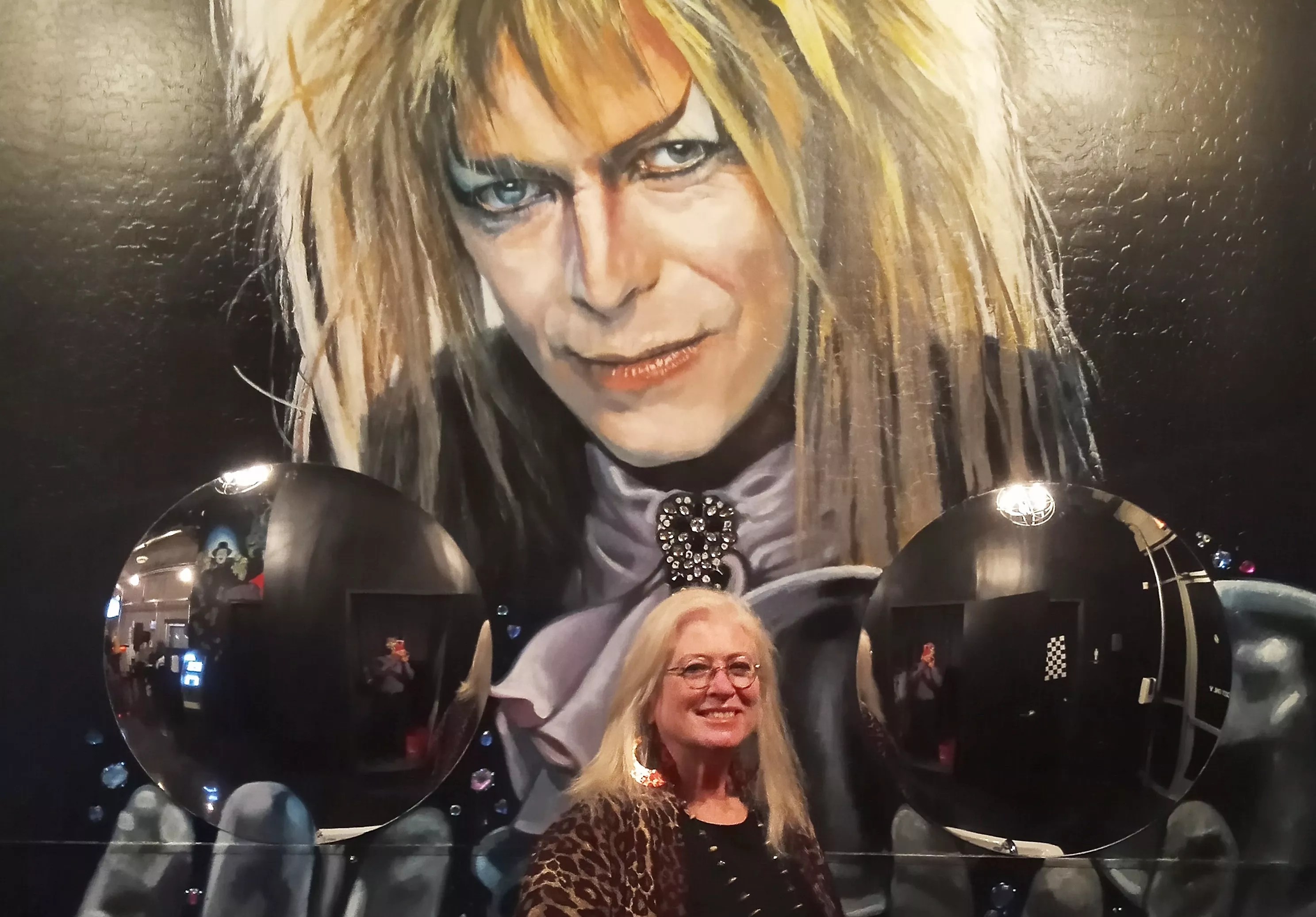 Artist Maggie Keane with her mural of Jareth the Goblin King at Player 1 Arcade.
