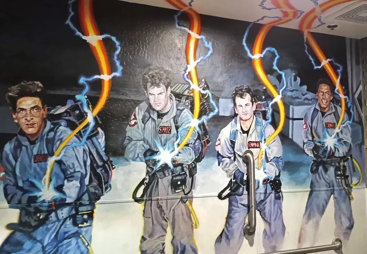 Inside the family restroom, you’ll find several Ghostbusters murals while the men’s room includes homages to the videos for Peter Gabriel’s “Sledgehammer,” the Beastie Boys’ “(You Gotta) Fight for Your Right (To Party!),” and other music from MTV’s golden age.