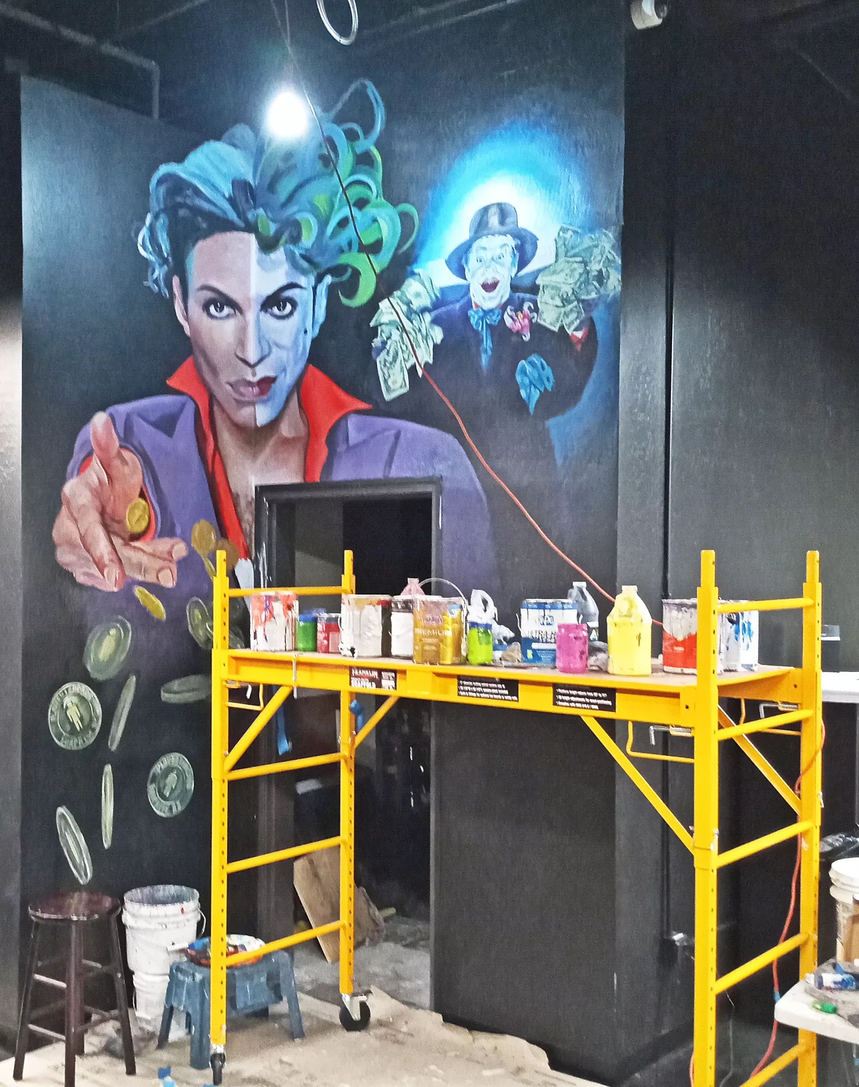 “It was originally going to be something with paisleys, but it was brought up that Prince did songs for the Batman soundtrack,” LeMieux says. “Kevin is a huge Jack Nicholson fan, so we mashed those ideas together and had [a painting of] Prince dropping tokens where we have our token machine next to Nicholson throwing out money like did in the movie.”