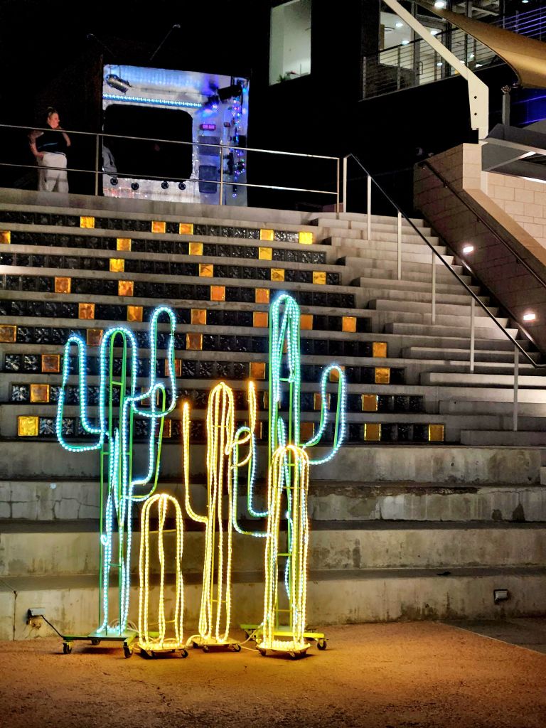 Saguaro cactuses light up the Mesa Arts Center campus.