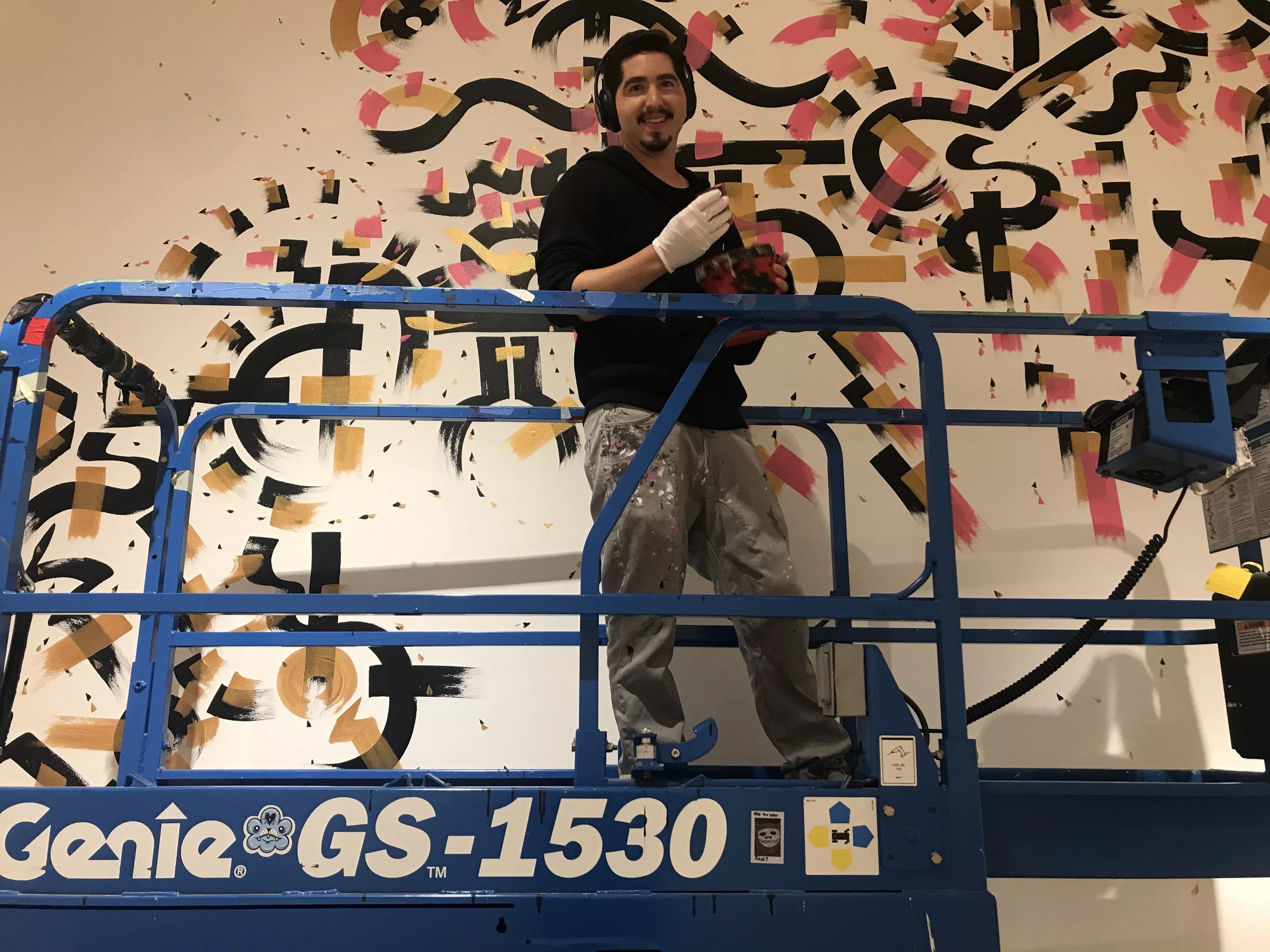 Padilla is also colorblind, which is one reason he prefers to work mostly in black and white. But his Mesa installation also includes other colors, including gold and pink. “Gold construes jazz to me, with the bright, jumpy feeling of the instruments.” Padilla spent several days on the installation wearing headsets, often painting atop a scissor lift as he layered in new lines and color.