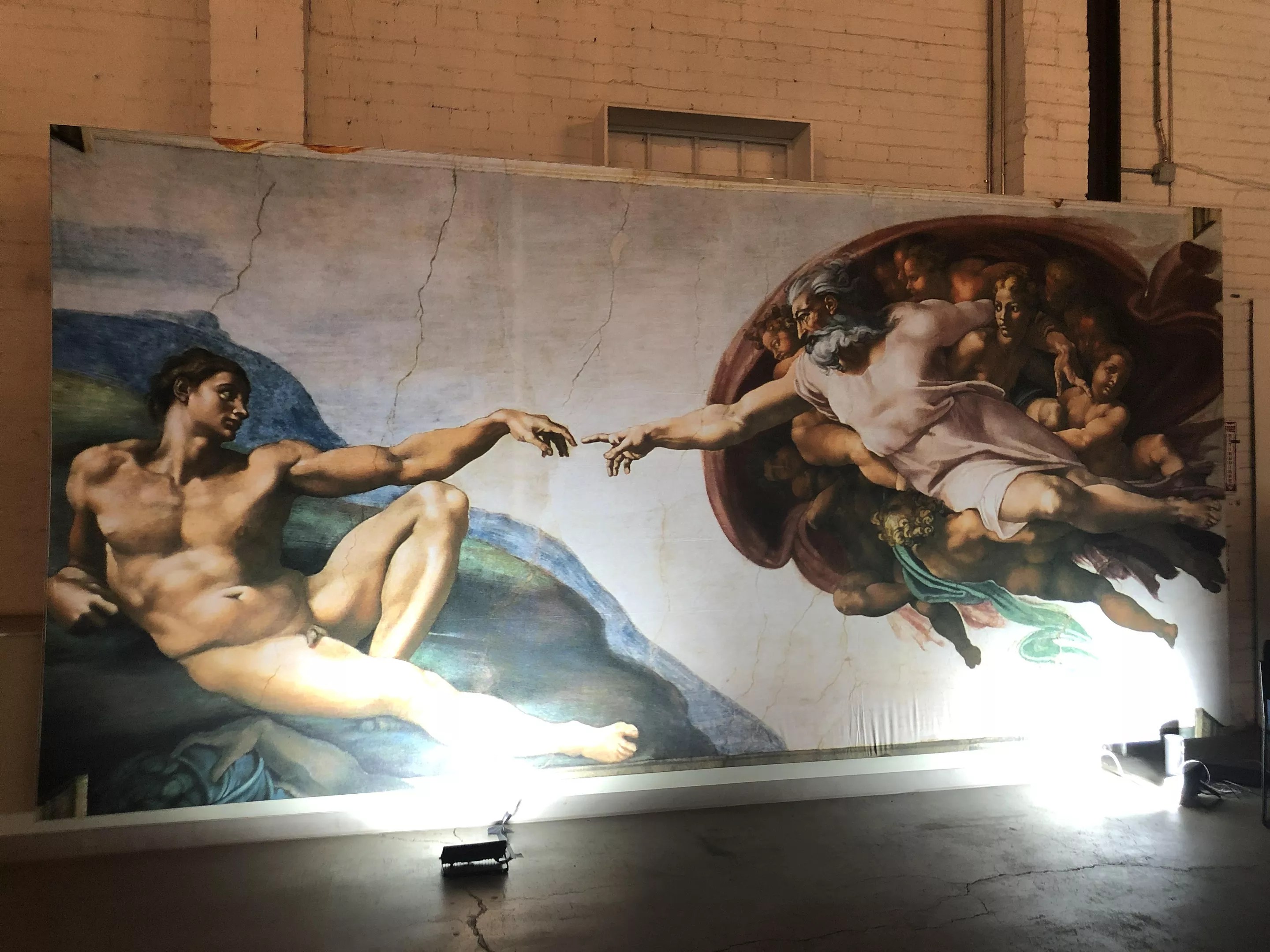 Biallas got exclusive permission from Bridgeman Images, the agency that does image licensing for the Vatican, to create life-size reproductions of Sistine works. The images are printed on Decotex fabric, which he says replicates the look of a fresco. The Creation panels are about 9 feet tall and 18 feet wide; most of the prophets are about 12 to 13 feet high. The only piece in the exhibition that is not life-size is The Last Judgment, because The Croft couldn’t accommodate its 45-foot height; Biallas says he does have a life-size version he uses when the venue can fit it in.