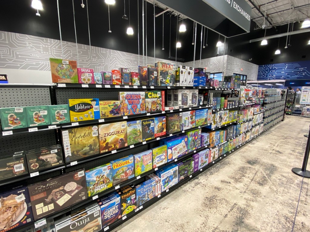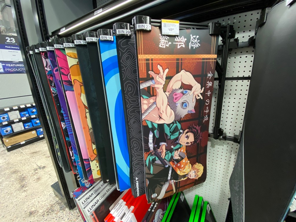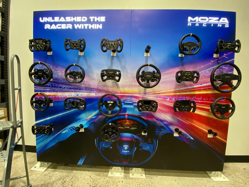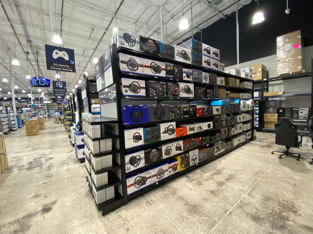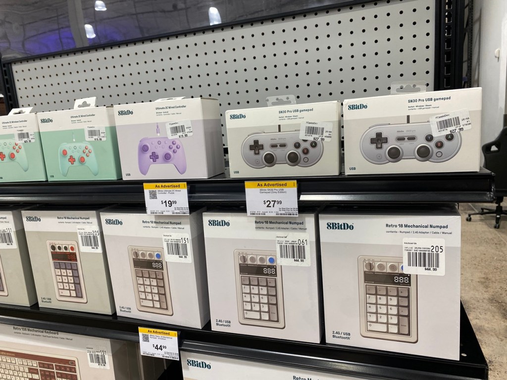 Then there’s the gaming area at Micro Center. Consoles, custom rigs, keyboards and other gear fill multiple rows. There are also plenty of controllers. Shelves stacked with 8BitDo pads in soft retro pastels and razor-sharp modern palettes. An entire wall is dedicated to steering wheels for driving simulators. Plus force feedback bases, pedal sets and other gear.