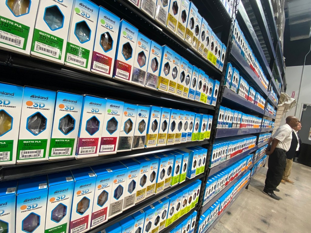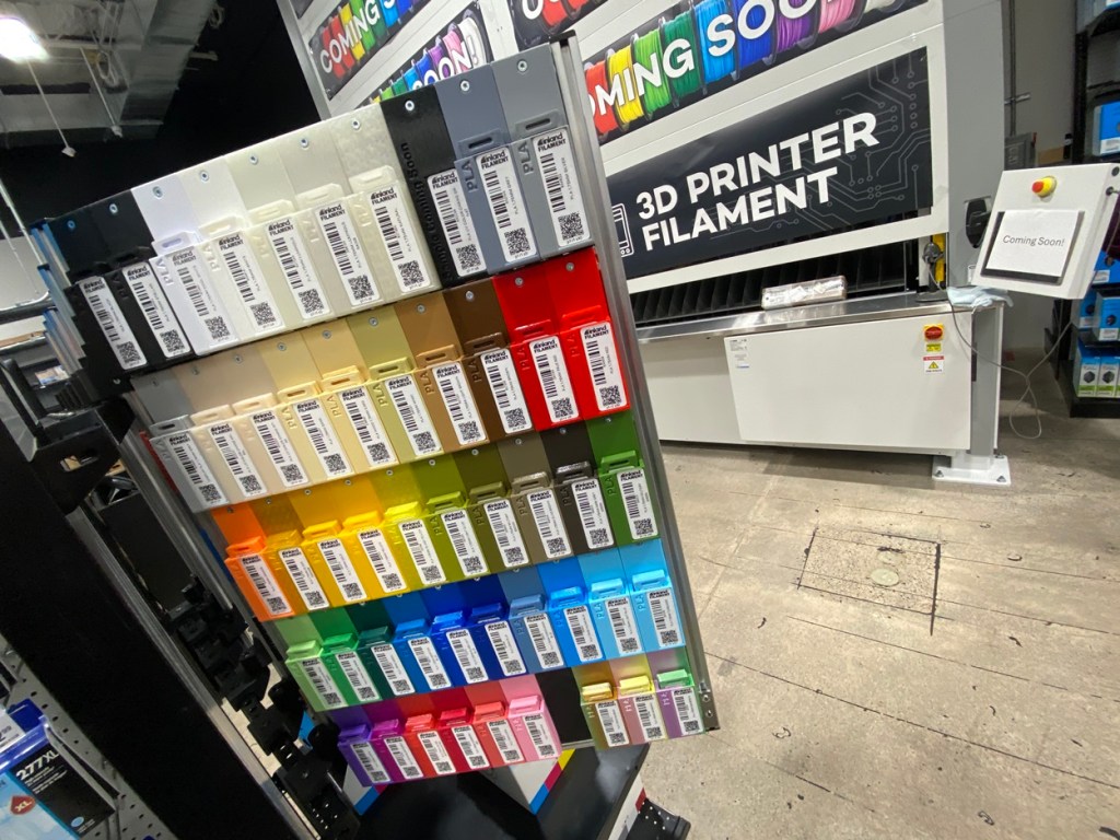 Over in the maker zone, a wall filled with a rainbow selection of filament spools. Neon pink. Cool glacier blue. Matte stone gray. Transparent orange that look like gummies. If you can imagine it, you can print it.