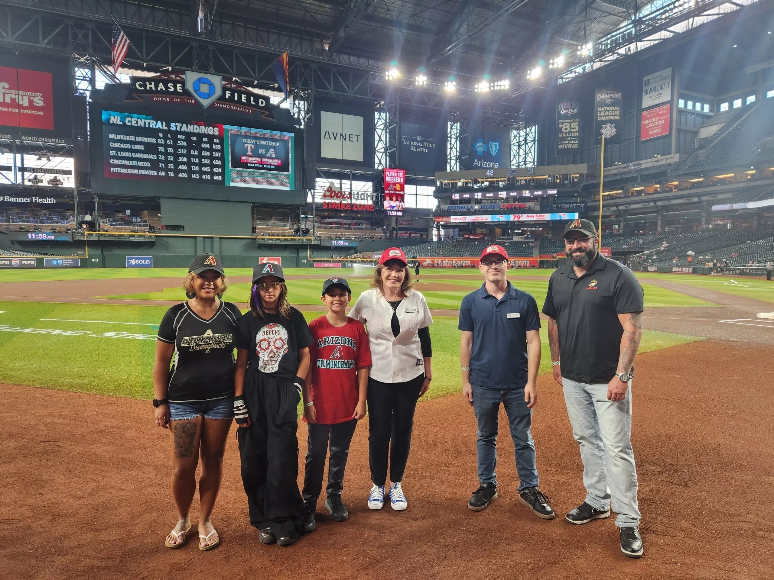 Margy Bons joins Arizona Diamondbacks staff and a military family at Chase Field during a ceremony honoring the family’s service.