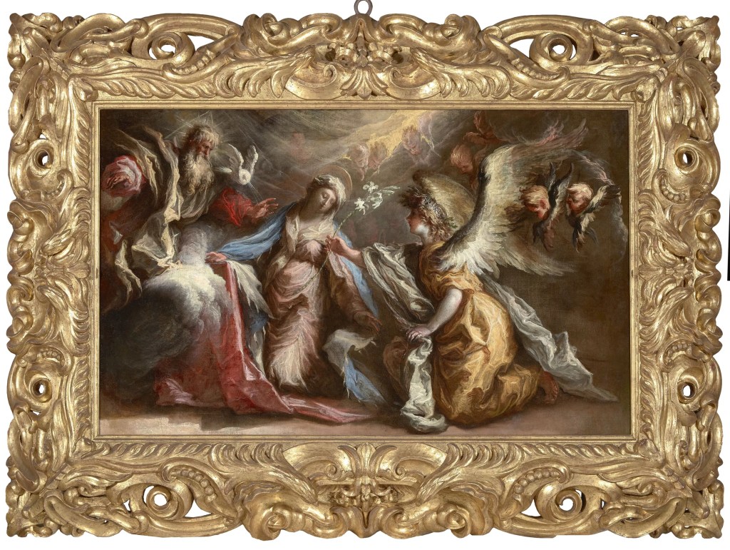 The first of these thematic groups includes works depicting Biblical stories, including Judith beheading Holofernes (from the apocryphal Book of Judith); God rebuking Cain for murdering his brother; Salome with the head of John the Baptist; and Mary with the infant Jesus (featured in more than one painting). Some paintings in this thematic group, such as Alessandro Gherardini’s painting of the Annunciation (the angel Gabriel’s announcement to Mary that she would give birth to Jesus), are dense with symbolic imagery; the gallery’s placards provide helpful information to guide the viewer.