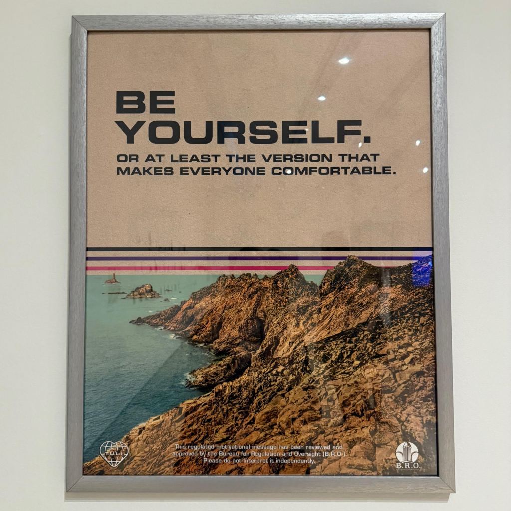 Near the hallway to the freight elevator hangs a bulletin board that may, at first glance appear not to be part of the exhibit at all. Upon closer inspection, though, you see a notice for cancelation of an office potluck (“due to ongoing concern regarding acceptable spice levels”), a directive to return all borrowed coping mechanisms by the end of the day and a notice of fridge cleanout (in accordance with Smell Neutrality Policy 14.6).