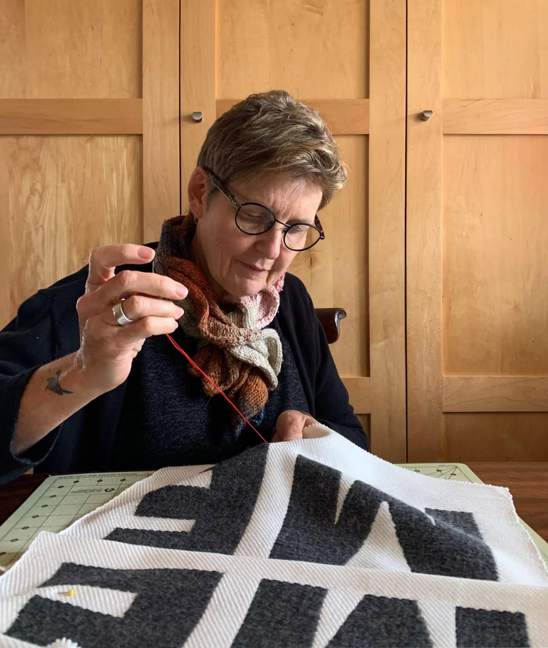 Several of her masks are made with red and blue fabric, because she’s got plenty of that on hand these days. Late last year, Morton launched a national project called the Violet Protest, which involves making small textile squares in red and blue to highlight values such as civility, creativity, and compassion.