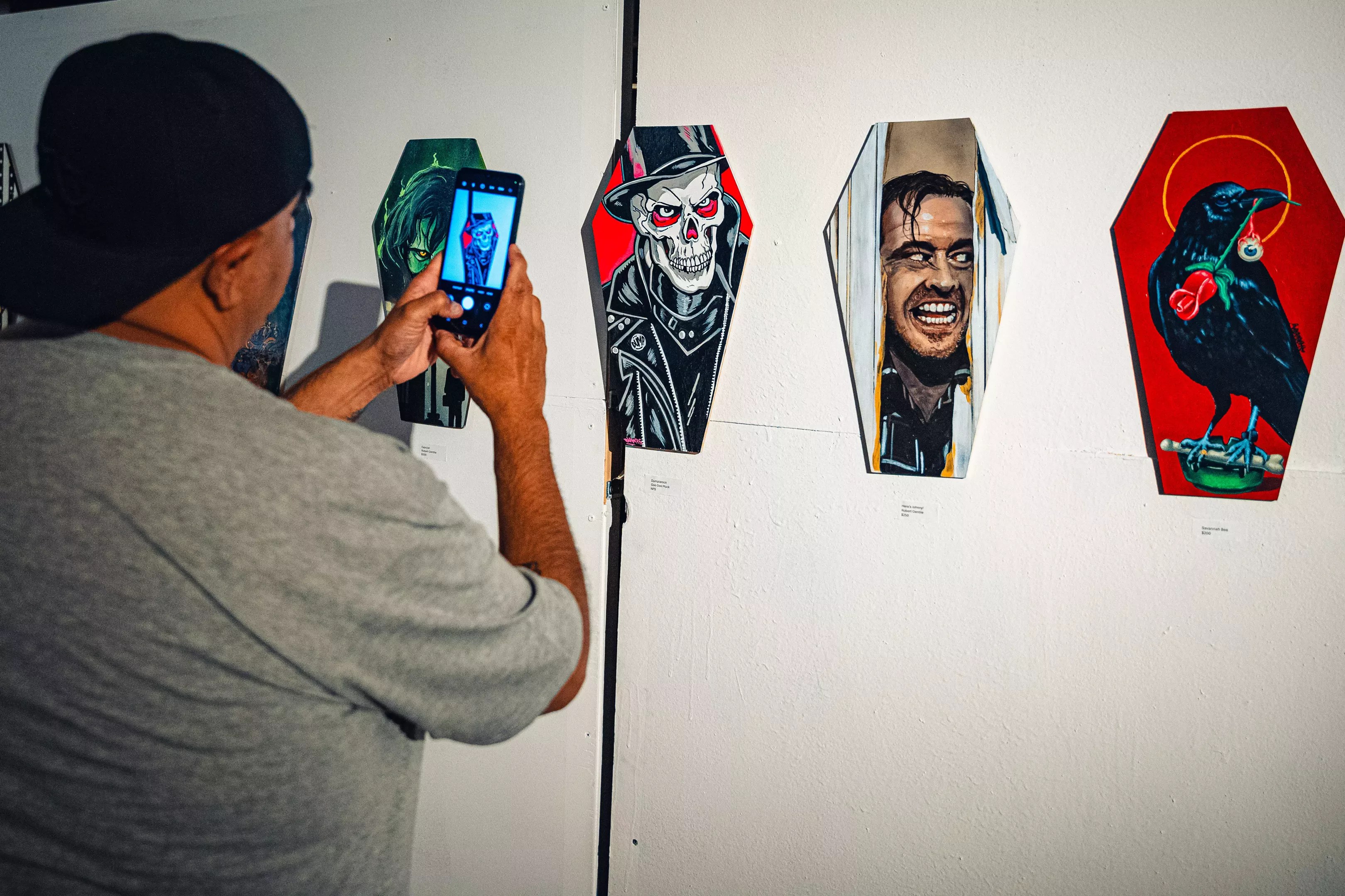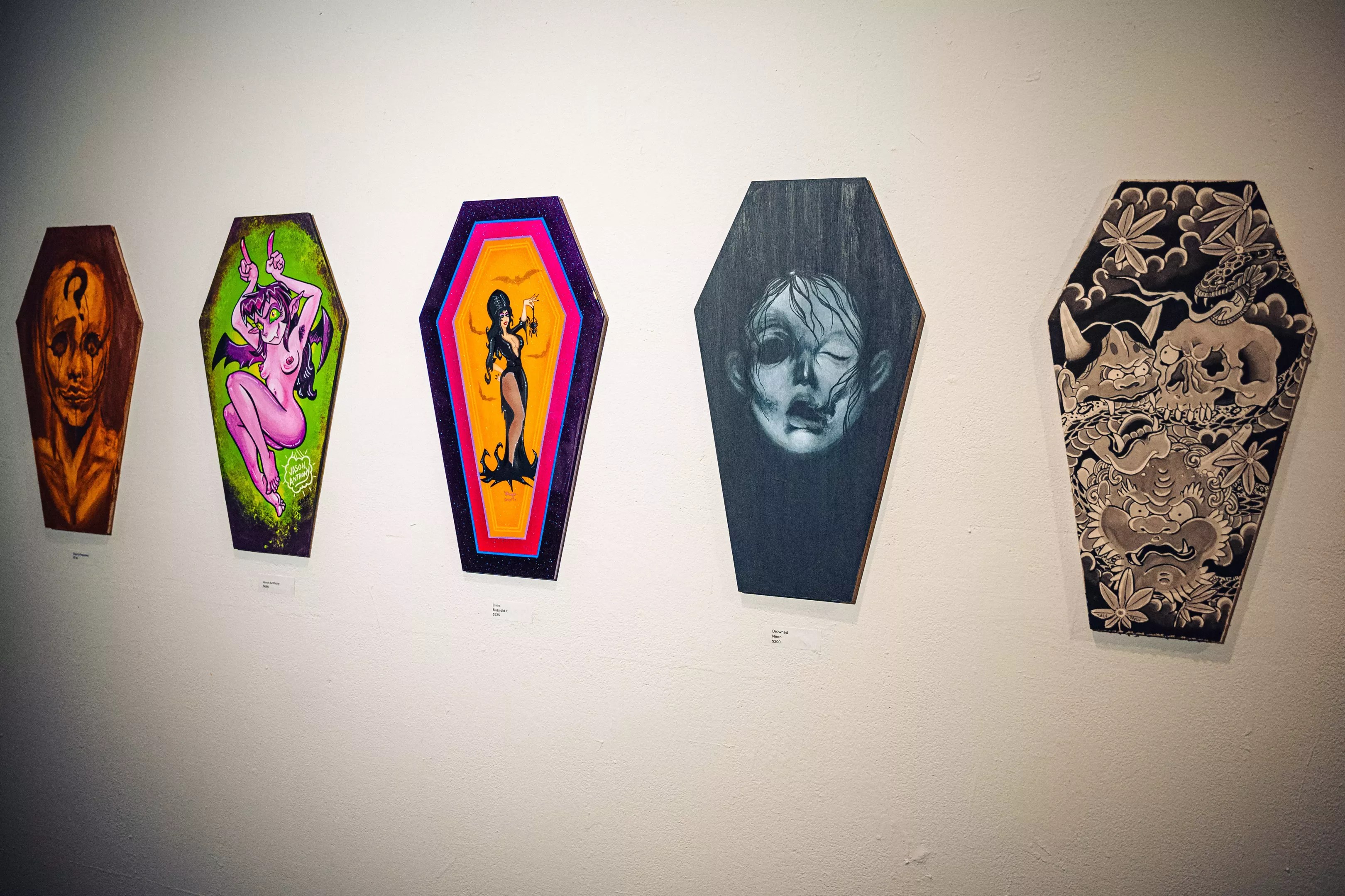 Local artists didn’t let the odd shape or small dimensions of coffin-shaped canvases inhibit their creativity for a group show at Grand Arthaus on Grand Avenue in downtown Phoenix.