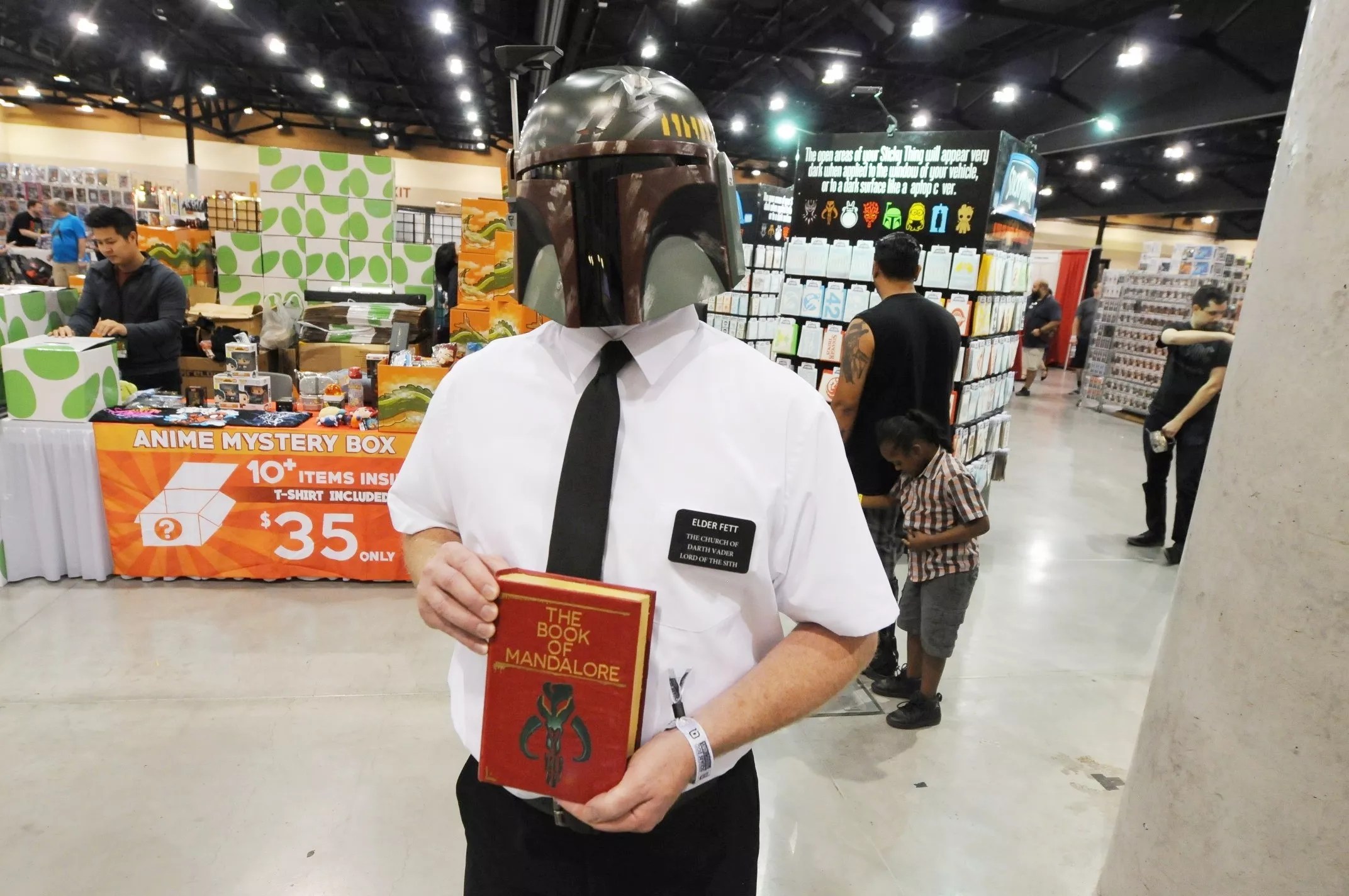 One of the more humorous costumes seen at Phoenix Comic Fest was this amusing mashup of Star Wars bounty hunter Boba Fett with a Mormon elder. Tucson resident Matthew Copely portrayed the character, who sported a name badge proclaiming his membership in the “Church of Darth Vader Lord of the Sith” and carrying around a Book of Mandalore.