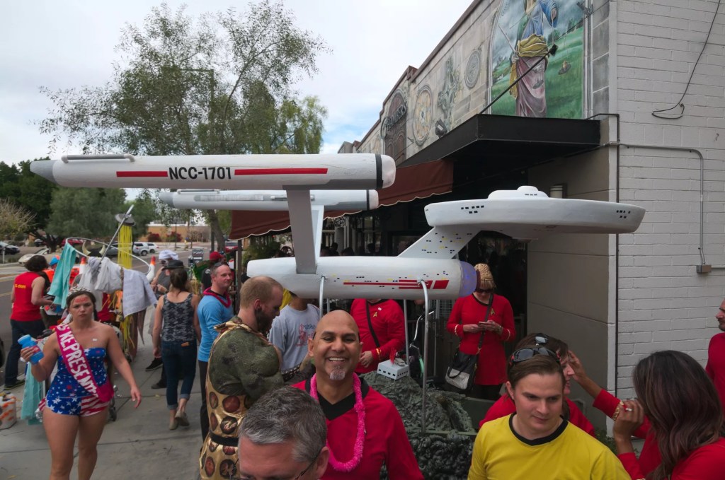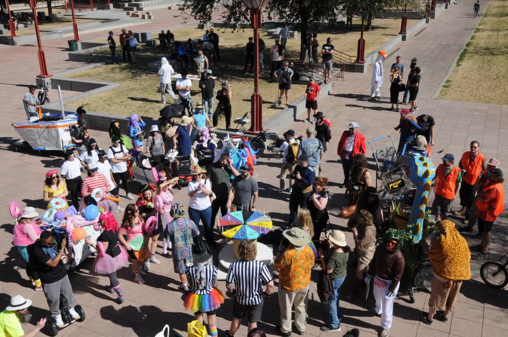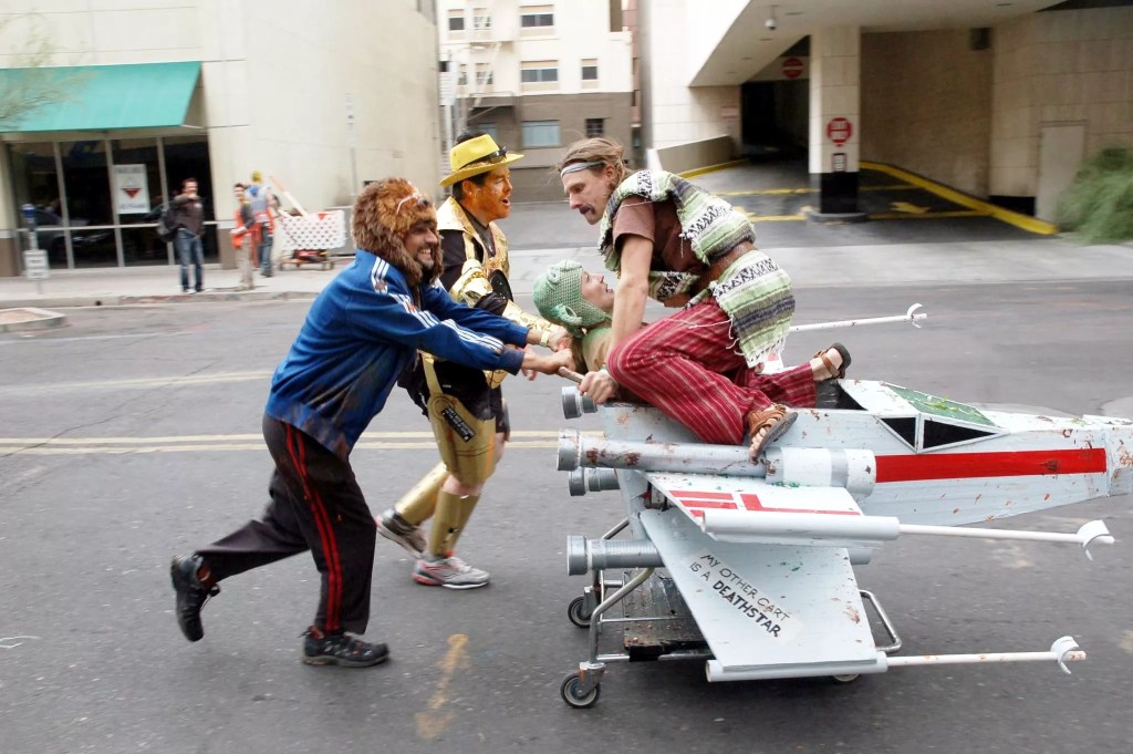 The event, put on by the Arizona Cacaphony Society, lives in the space between bar crawl, urban prank and performance art. Teams in full costume push elaborately decorated shopping carts along a loosely defined route, stopping at bars, completing challenges and baffling plenty of unsuspecting onlookers.