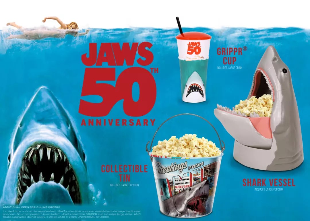 At AMC Theatres, screenings begin on Thursday, Aug. 28. “Jaws” fans can purchase two different popcorn buckets: one, a shark-shaped vessel whose mouth opens, and the other, a tin bucket with a “Welcome to Amity” theme. The theater chain will also sell a drink cup with a design based on the film’s iconic movie poster.