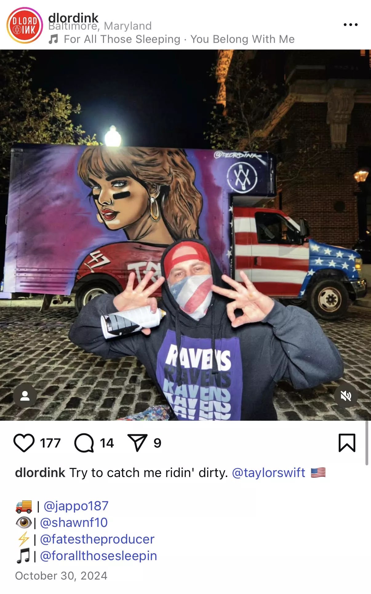 A particularly noxious post depicts Lorden in front of a newly finished work: a panel truck depicting Taylor Swift in a Trump jersey. (Of course, Taylor Swift is not a Trump supporter.) Lorden, dressed in a black hoodie, a backward red ballcap and an American flag bandana covering the bottom half of his face, flashes the “OK” hand gesture that in recent years has been linked to white supremacists and extremist groups like the Proud Boys.